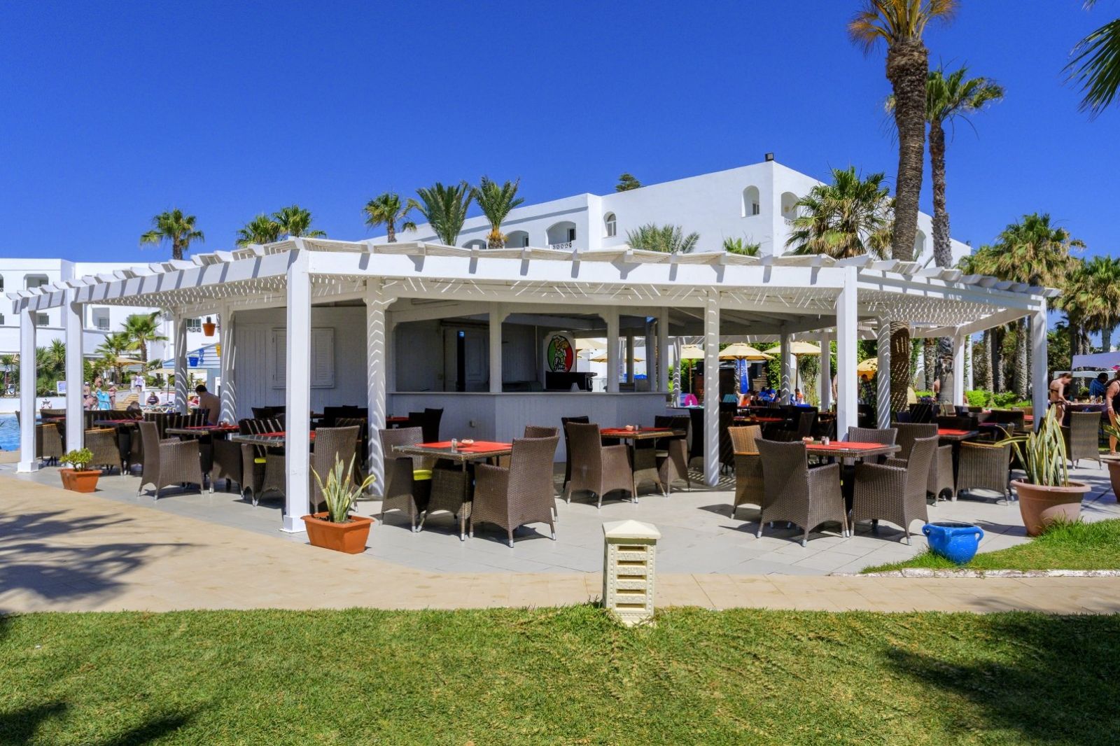 Основен ресторант Thusdrus, 2 а ла карт ресторанта - един с интернационална кухня и втори на плажа, барбекю ресторант (едно безплатно посещение на престой, след предварителна резервация), лоби бар, бар басейн, мавританско кафене, 2 открити басейна, закрит басейн, вътрешен басейн с морска вода в таласо центъра, 5 водни пързалки за възрастни и 1 за деца, анимация, Wi-Fi в лобито, общи части и стаите, сувенирен магазин, обмяна на валута, паркинг.