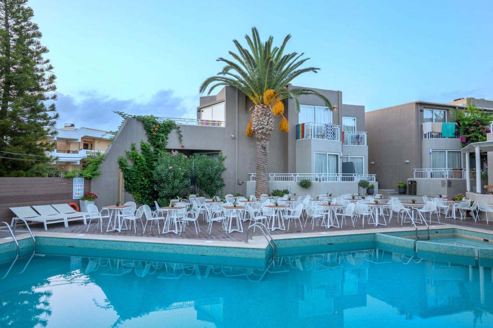 В стаите са на разположение: климатик, телефон, ADSL достъп до интернет (срещу заплащане), сателитна телевизия, сейф (срещу заплащане), хладилник, сешоар, баня с вана/душ, балкон/тераса.Double Superior: Напълно реновирани са през 2012 г. Нови мебели, LCD 32” телевизор, баня с хидромасажен душ, анатомични екологични матраци, халати и чехли, плажни кърпи, набор за кафе/чай.Family Room: Двойни стаи, някои са в стил мезонети. Спалня и всекидневна.Допълнително легло – стандартно или разтегателен диван.Почистване на стаите – 6 пъти седмично.Смяна на кърпи – ежедневно.Смяна на спално бельо – 3 пъти седмично.