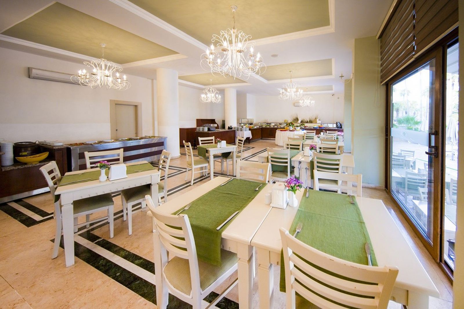 Хотелът разполага общо с 95 стаи, всички оборудвани с климатик, сателитна телевизия, телефон, баня с душ, сешоар, мини бар (празен), сейф (платен), балкон. Почистване на стаите – всеки ден, смяна на спалното бельо и кърпите – 2 пъти в седмицата.
