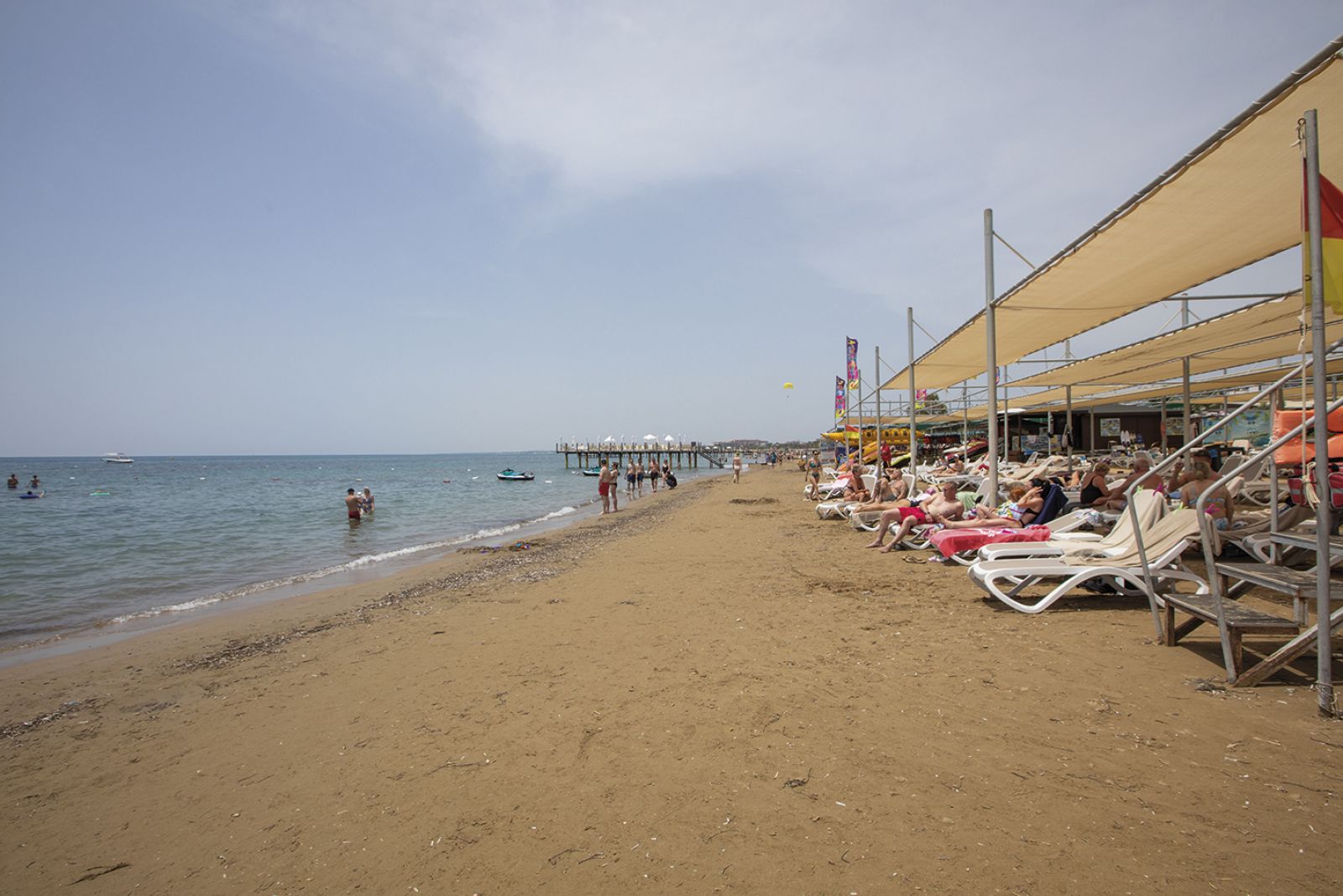 На 300 м. от плажа, пясъчно -чакълест. Чадъри, шезлонги и плажни кърпи на плажа и при басейна - безплатно.