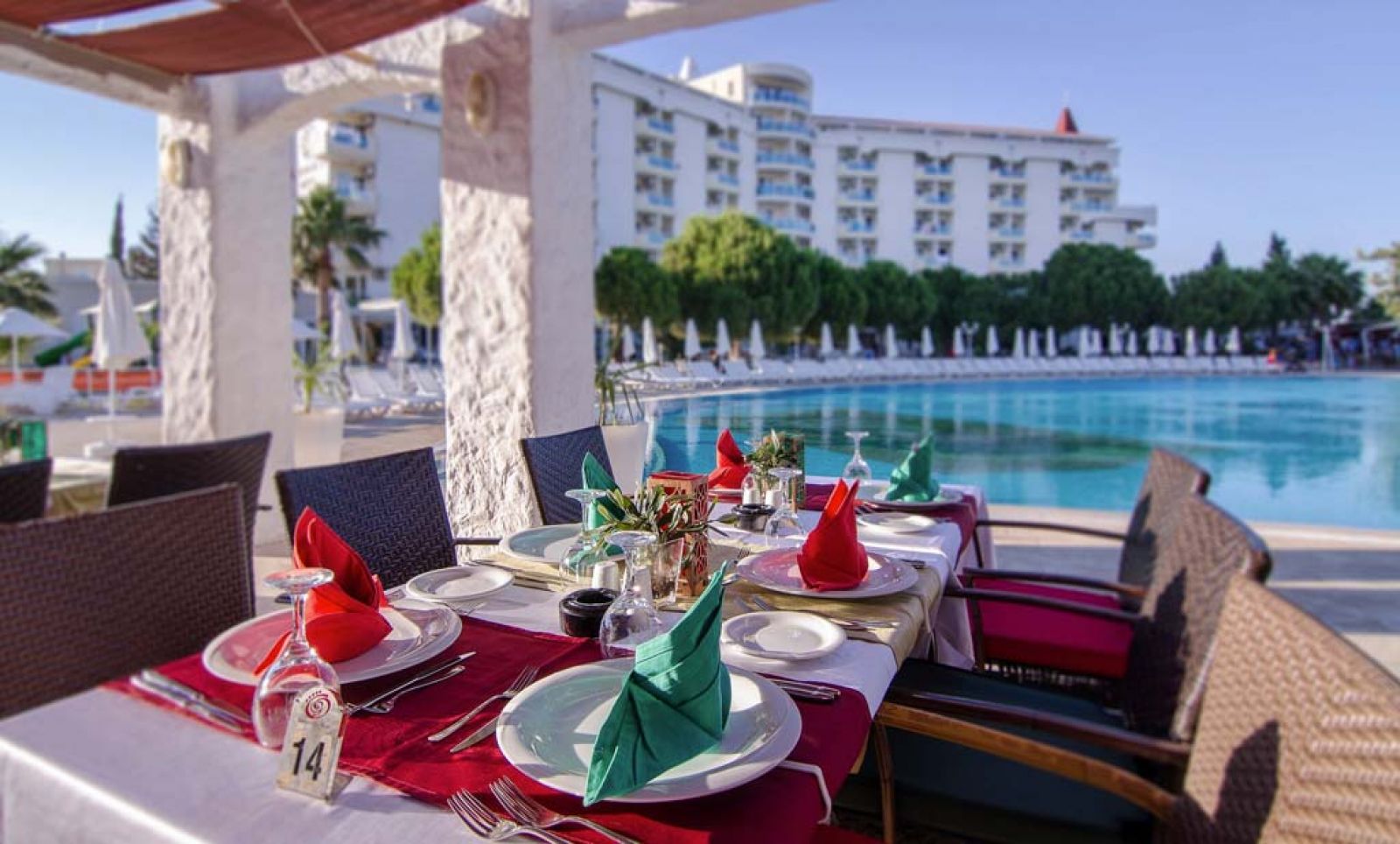 All inclusive – закуска, обяд и вечеря, междинни хранения, местни алкохолни и безалкохолни напитки - без лимит (съгласно концепцията на хотела).