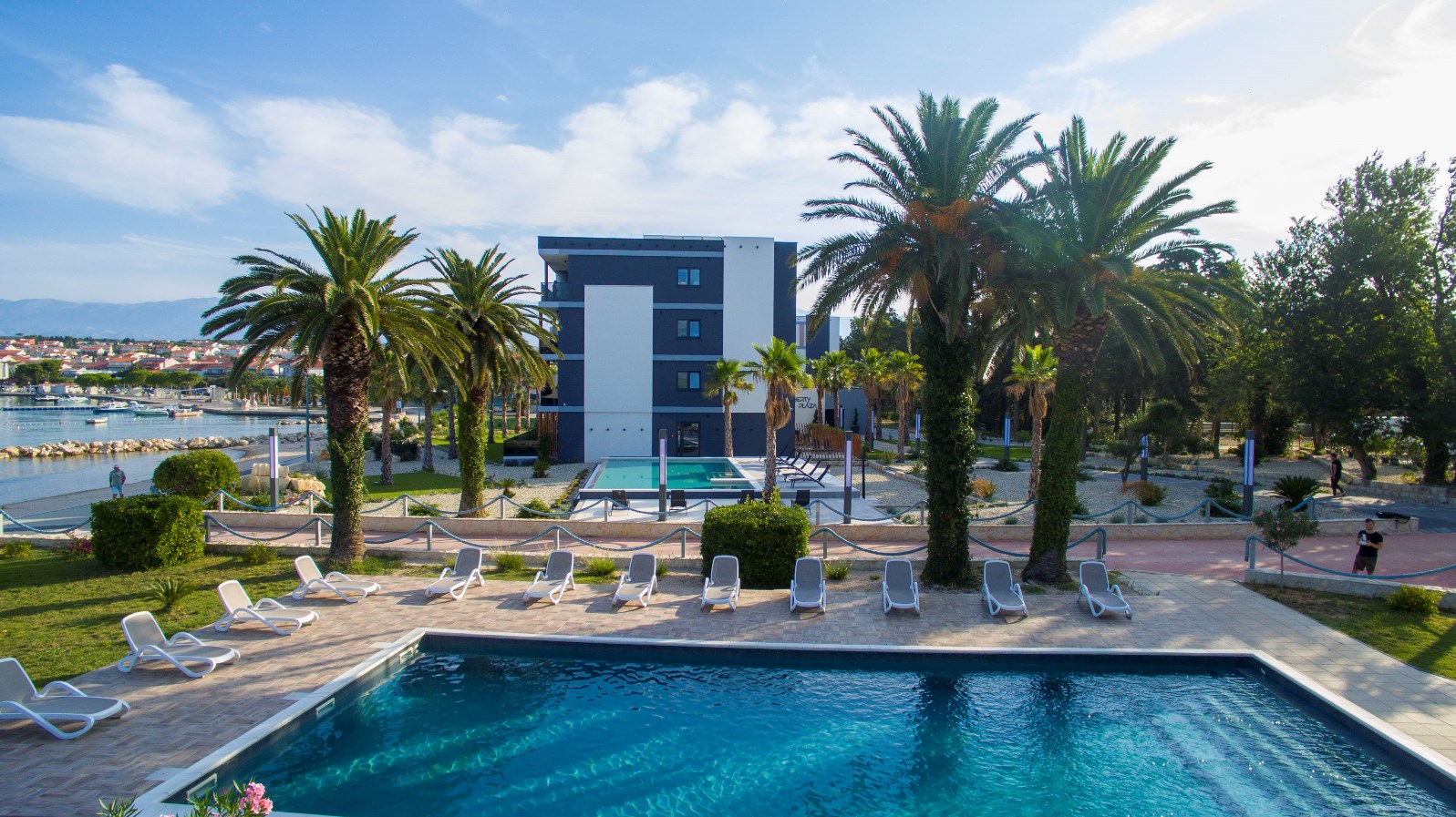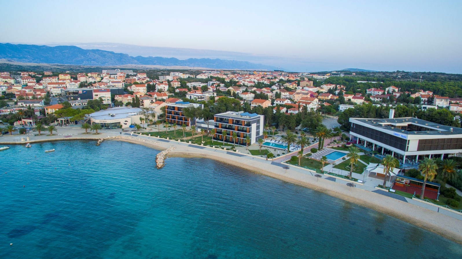 Хотелът е разположен на първа линия на плажа в град Новаля в северната част на остров Паг.