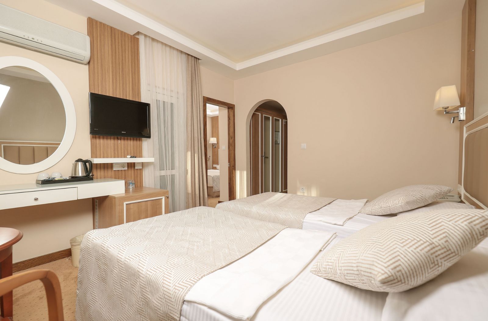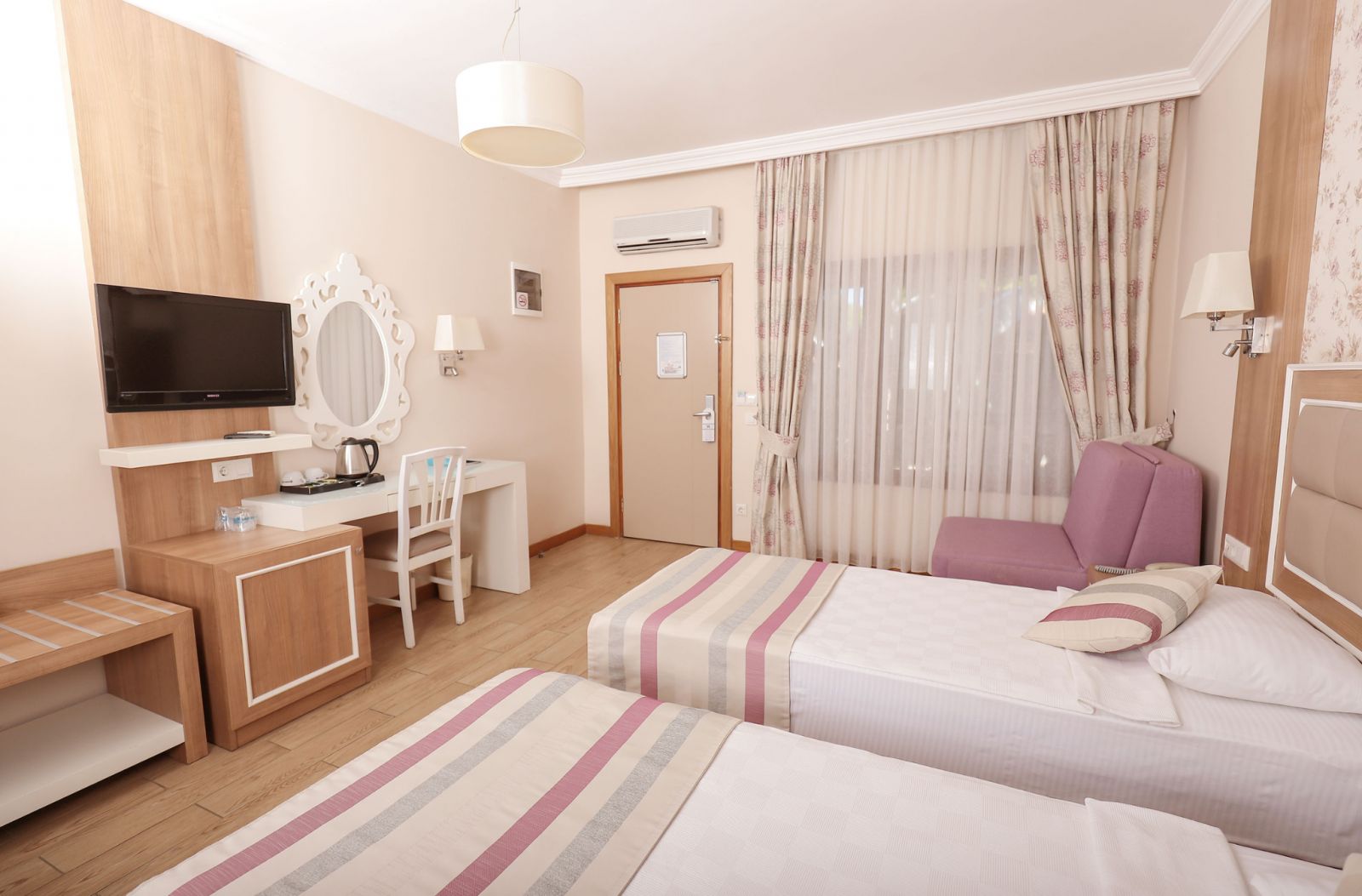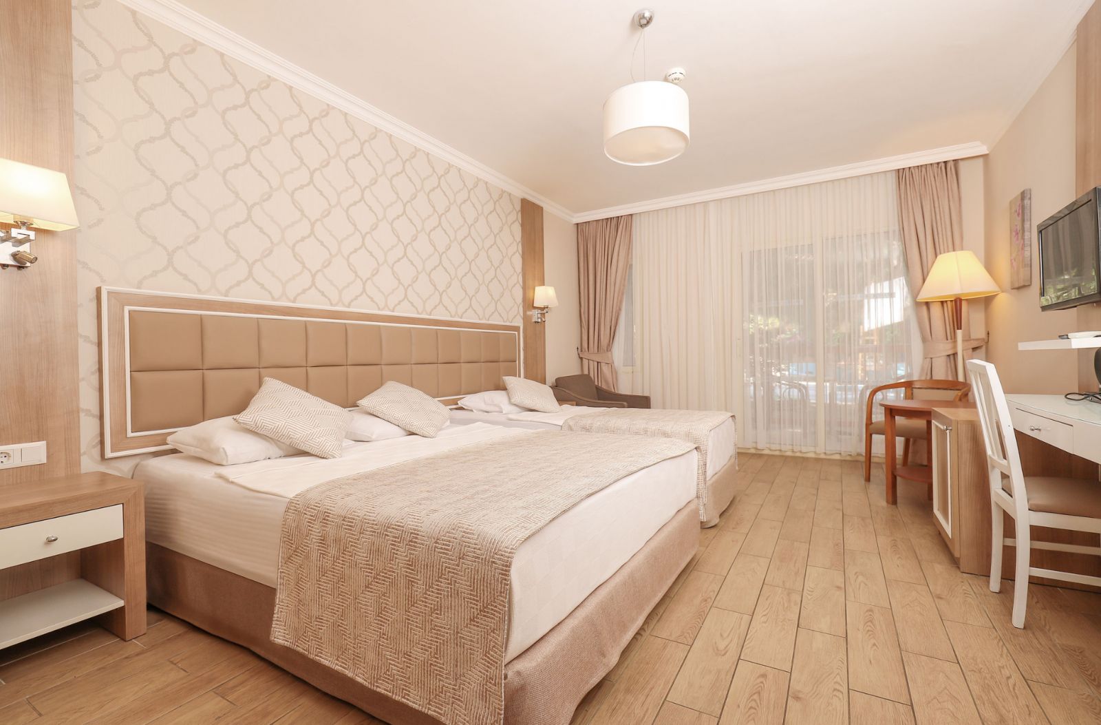 Всички стаи са оборудвани с климатик, телевизор, телефон, баня с душ/вана, сешоар, минибар (безплатно зареждане с вода и безалкохолни напитки ), сет за чай/кафе, сейф (безплатен), балкон или веранда. Почистване на стаите - всеки ден, смяна на спалното бельо и кърпите - 3 пъти в седмицата.