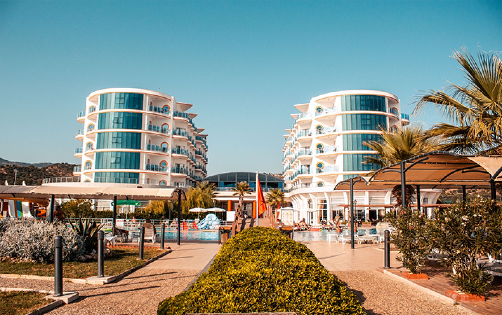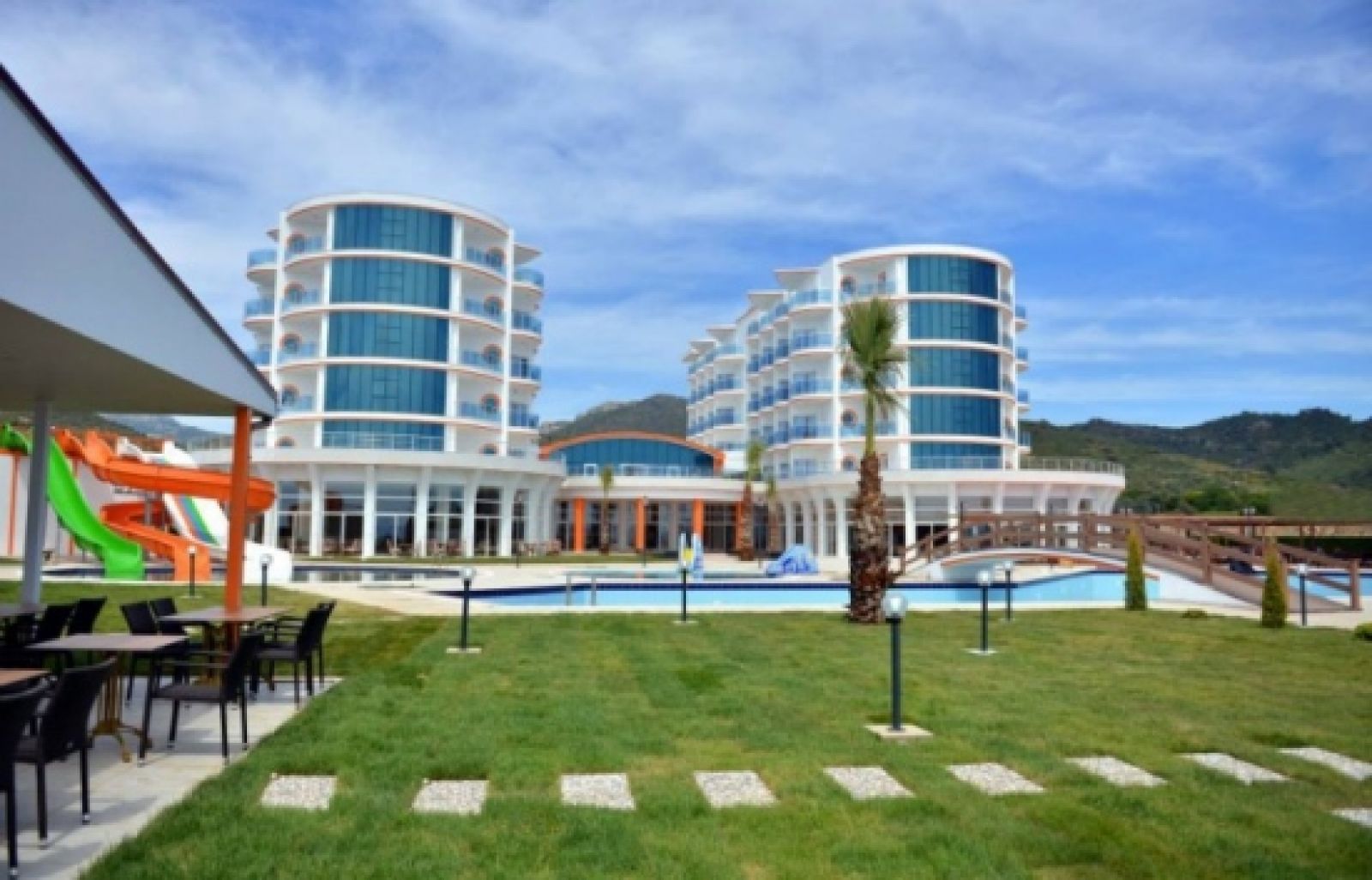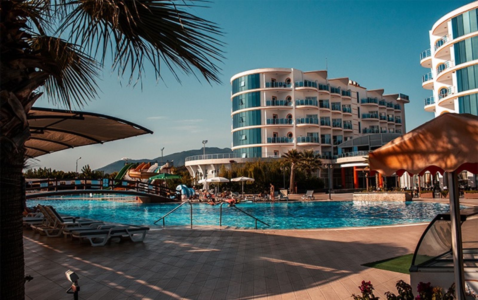 Основен ресторант, снек ресторант, 3 бара, открит басейн, закрит басейн, водни пързалки, магазини, СПА център, ТВ зала, паркинг.