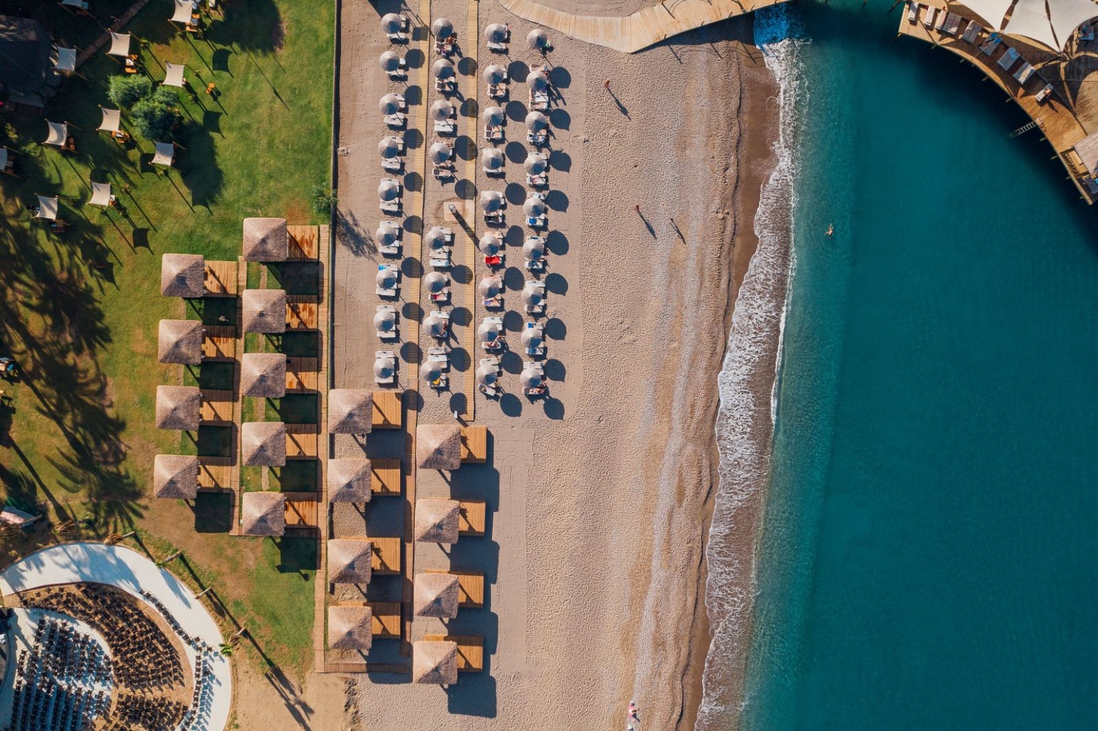 Собствен, пясъчно - чакълест. Чадъри, шезлонги и плажни кърпи на плажа и при басейна – безплатно.