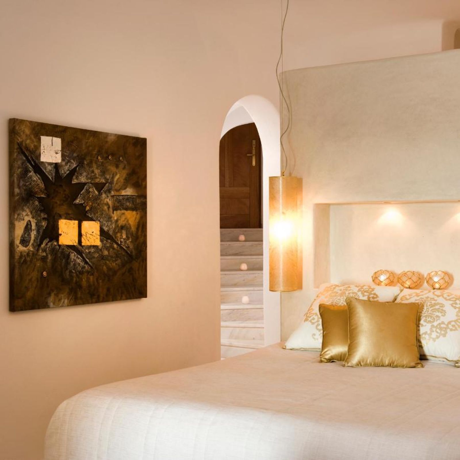 Климатик, телевизор, телефон, сейф в стаята, сешоар, халати и чехли, тоалетни принадлежности Apivita (гръцка натурална козметика), Мини бар Nespresso безплатно кафе, Безплатен WI-Fi, собствена веранда с гледка към калдерата и външно отопляемо джакузи, рум сервиз. Размер 45 кв. м.