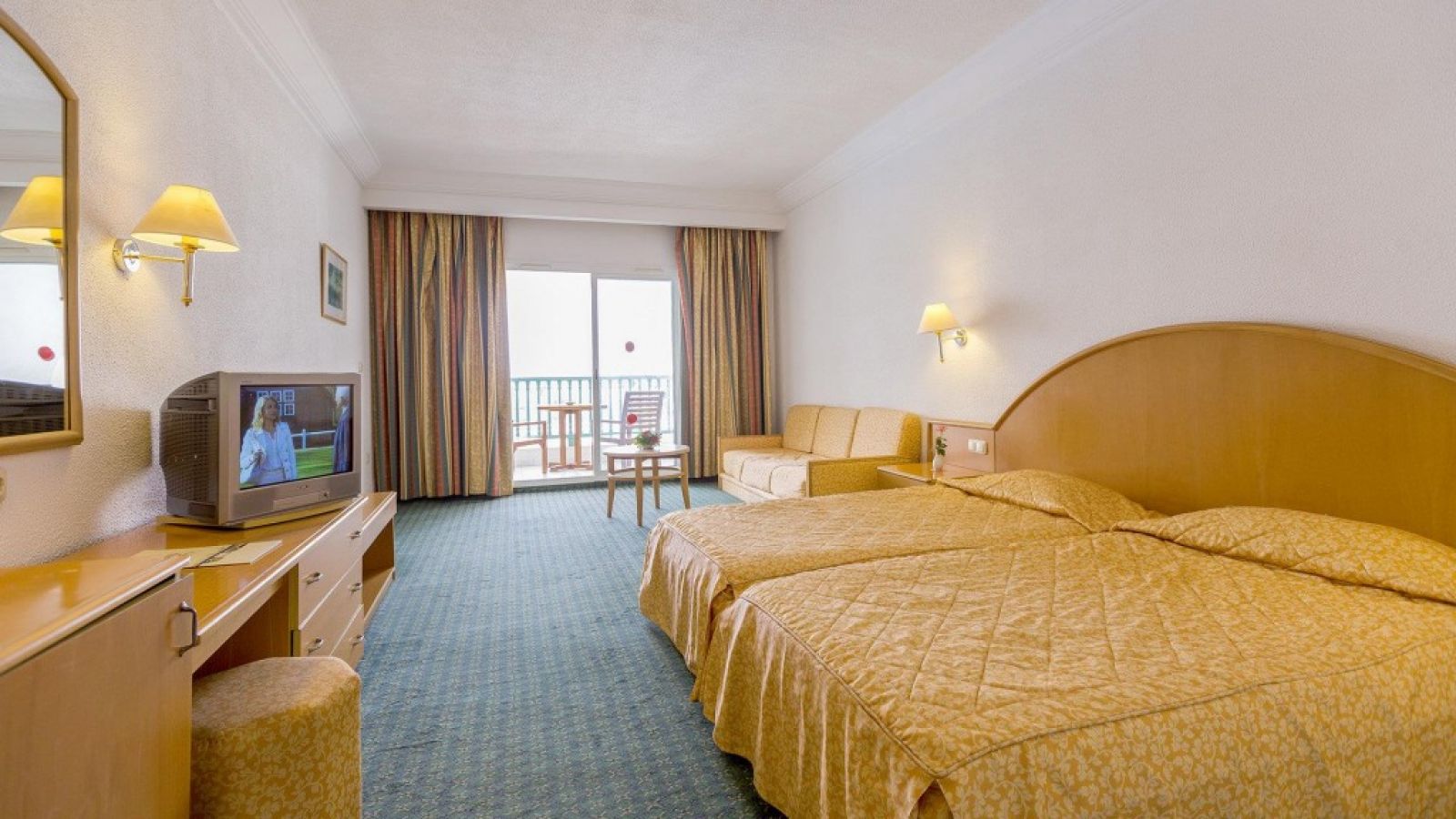 В стаите: Хотелът разполага с общо 505 стаи, разположени в две сгради - Standard Room (20-22 кв.м), Sea View Room (20-22 кв.м), Suite Junior (40 кв.м с хол). Всички стаи са оборудвани с климатик, телевизор, баня с вана/душ, сешоар (при наличност и срещу депозит), минибар (празен), сейф (платен), тераса или балкон. Почистване на стаите - всеки ден.