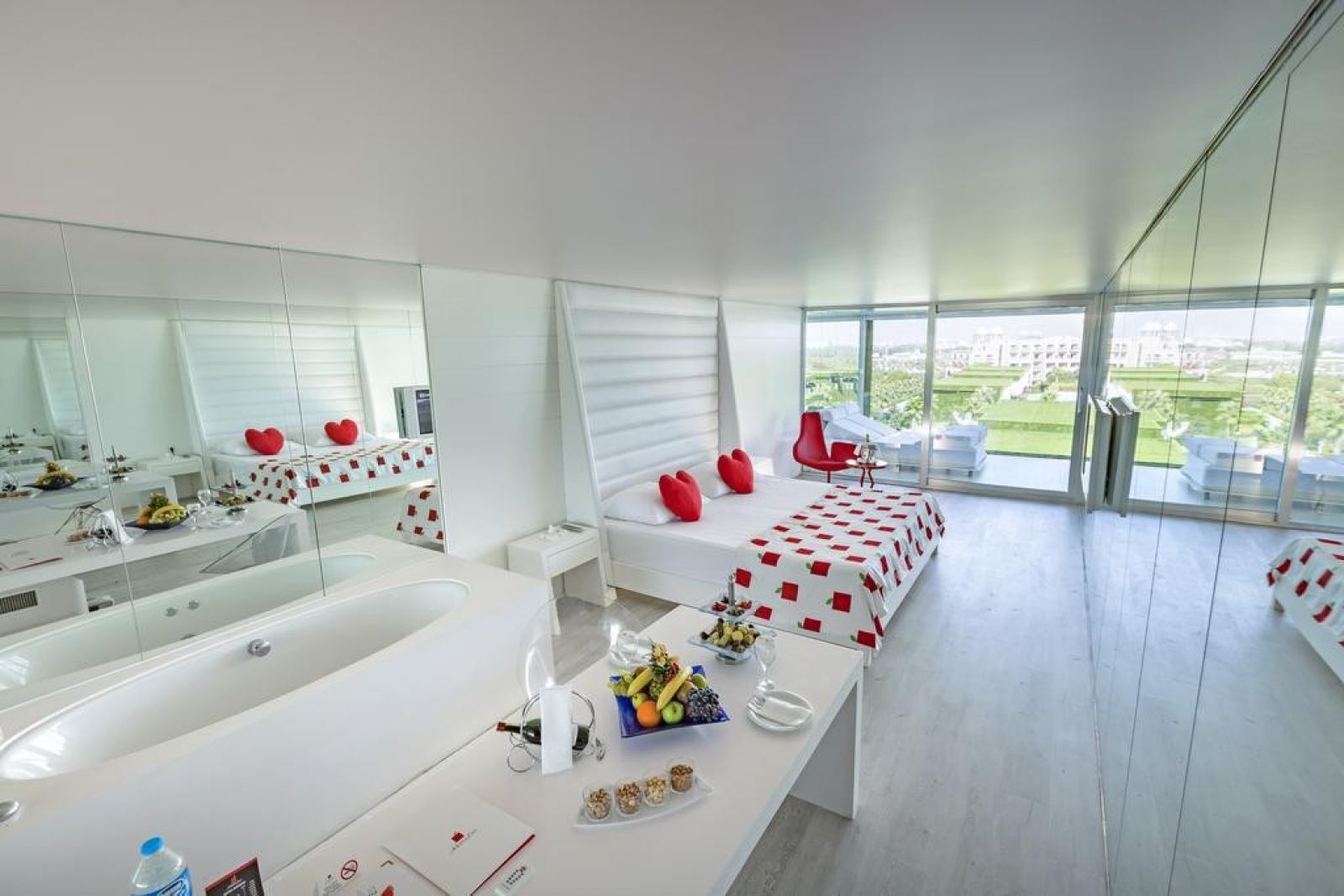 В стаите: Състои се от една 6-етажна основна сграда с 476 стаи и 68 двуетажни вили. Стаите в основна сграда са оборудвани вана / душ (с ефект на парна кабина), минибар (безалкохолни напитки, бира, вода - зареждане всеки ден; макси бар - платено),106 см плазмен телевизор със сателитна телевизия, халати за баня (по заявка без зареждане), сет за приготвяне на кафе и чай, централна климатизация, джакузи, дизайнерско бюро, лед осветление, телефон,чехли, балконно терапевтично легло, електронен сейф, безжичен интернет, светещо огледало за грим. Стаите във вилите са оборудвани с минибар (безалкохолни напитки, бира, вода - зареждане всеки ден; макси бар - платено), 106 см плазмен телевизор със сателитна телевизия, халати за баня, климатик, джакузи, сауна, дизайнерско бюро, Led осветление, телефон, чехли, електронен сейф, безжичен интернет, светещо огледало за грим.