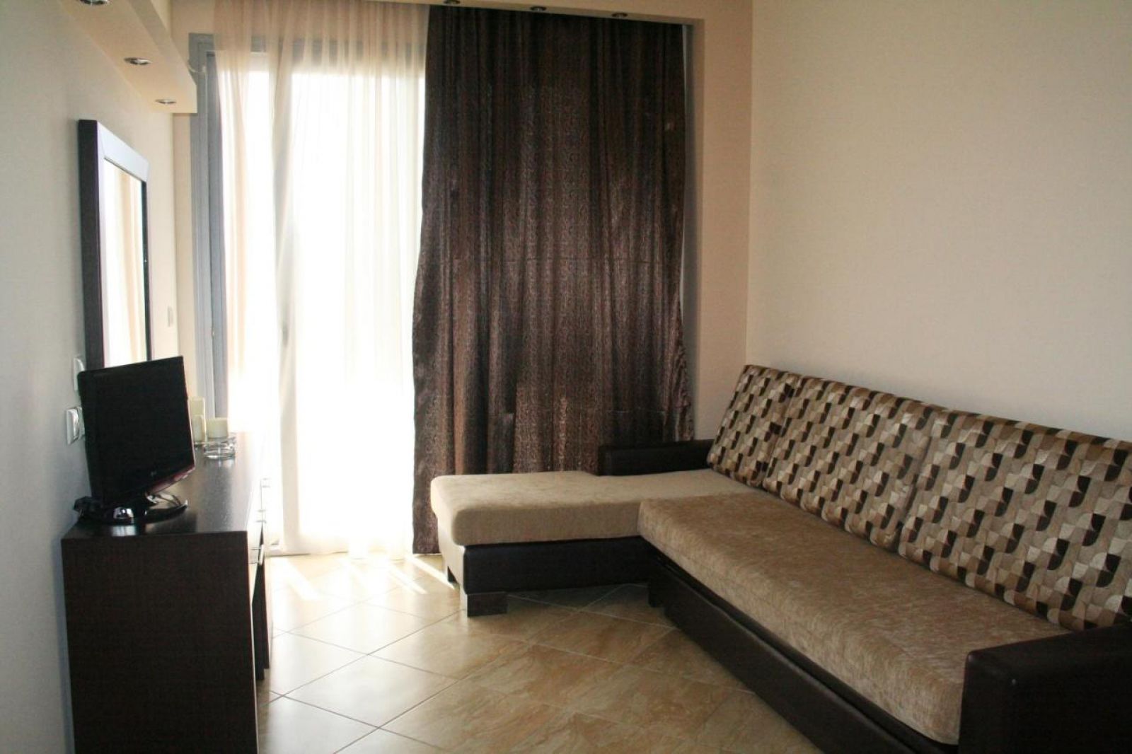 Apartment(~ 33 кв.м) Всекидневна с кухня (готварска печка с 3 котлона, фурна, микровълнова) и голям сгъваем ъглов диван (2.5x2), спалня с двойно легло.