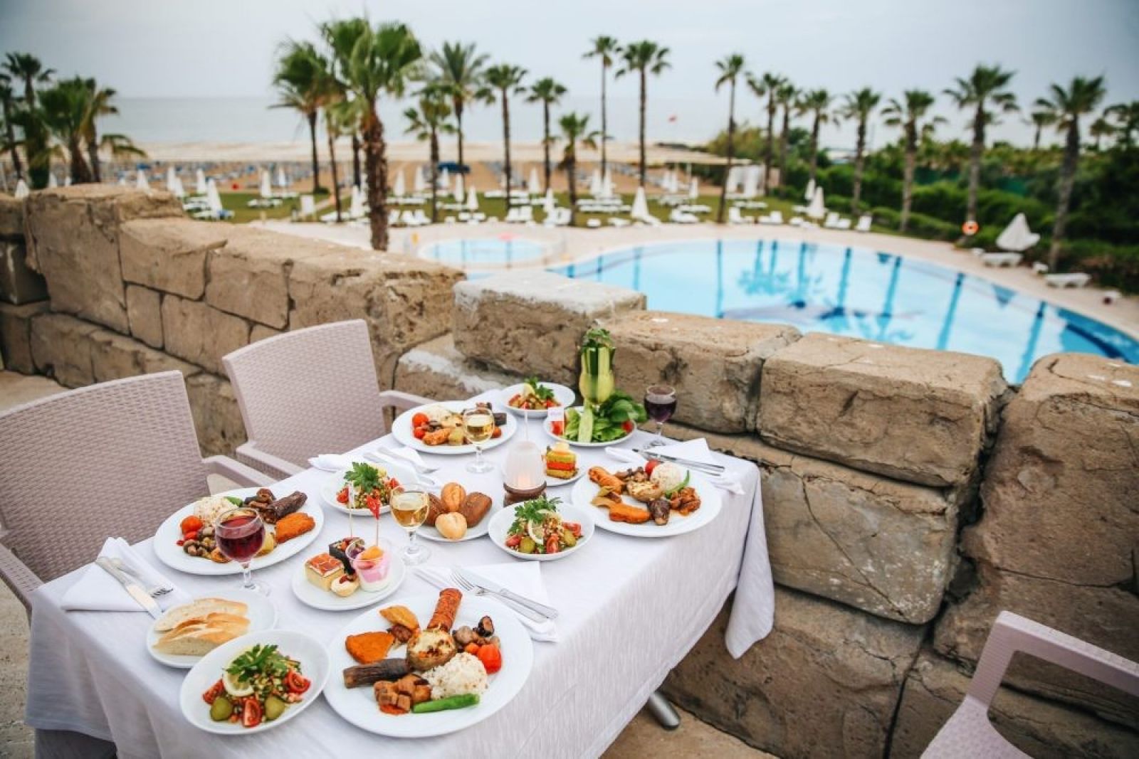На територията на хотела: Основен ресторант, 2 а-ла карт ресторанта (османски, италиански - с предварителна резервация, за целия престой се позволява 1 посещение на един ресторант – безплатно с предварителна резервация от предходния ден, от 15.06-15.09), лоби бар, бар при басейна, дискотека, снек бар, водни пързалки, открит басейн, закрит басейн, СПА център.