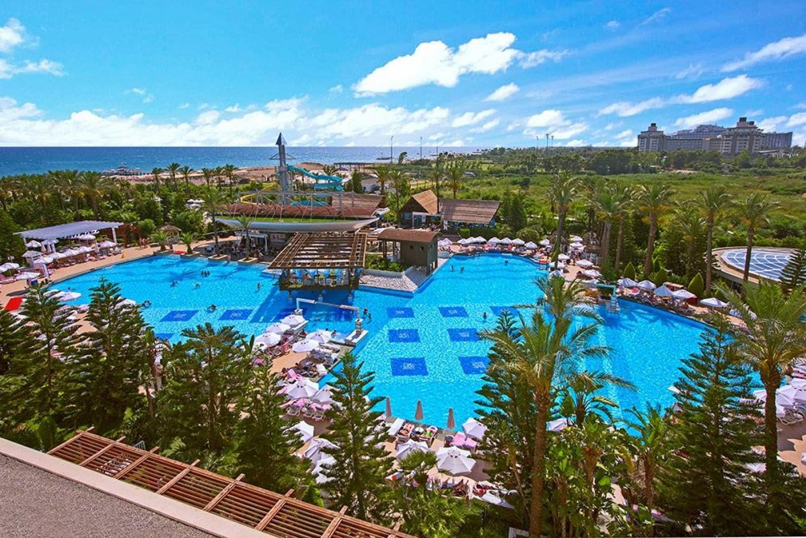 На територията на хотела: Хотелът предлага Wi-Fi във фоайето, обмяна на валута, конферентни зали (срещу заплащане), безплатен паркинг, лекарски услуги (срещу заплащане), пране (срещу заплащане), коли под наем (срещу заплащане), козметичен салон (срещу заплащане), амфитеатър и магазини (срещу заплащане). Основният ресторант "Amber" е отворен от 07:00 до 21:00 часа, няколко а ла карт ресторанта предлагат разнообразие от кухни: турска "Ottoman" (19:00–21:30), италианска "Dolche Vita" (19:00–21:30), японска "Teppanyaki" (19:00–21:30), мексиканска "Margarita" (19:00–21:30), китайска "Pekin" (19:00–21:30), риба "Blue Fish" (19:00–21:30) и суши "Dragon" (19:00–21:30). Има още сладкарница (11:00–18:00), лоби бар (08:00–00:00), Sport & Sneck бар (01:00–08:00), витаминен бар (10:00–18:00), снек бар (12:30–15:00), бар на плажа (10:00–00:00) и диско бар (23:00–02:00). За релакс и забавление, гостите могат да се насладят на голям плувен басейн (2321 кв. м), басейн с пързалки (309 кв. м) с четири водни пързалки, релакс басейн (312 кв. м) с отопление през зимата и закрит басейн (135 кв. м) с отопление през зимата.
