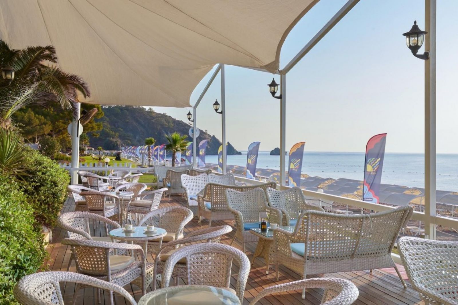 Плаж: На първа линия, непосредствено пред хотела, 155 м пясъчен и фин чакълест плаж, шезлонги, чадъри, плажни кърпи (с карта).