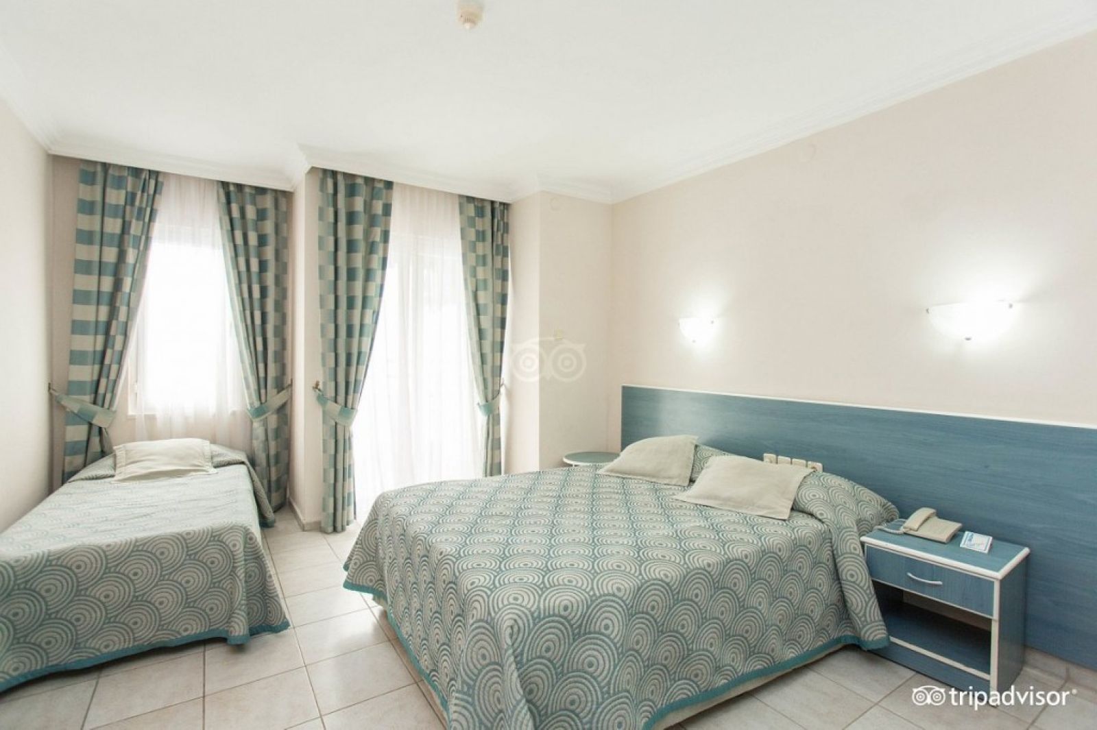 Разположение: Хотелът е разположен на 12 км. от гр.Алания, на 130 км. от летище Анталия, на 30 м през пътя от плажа по подземен преход. Построен през 2002 год.с обща площ от 3800м2., реновиран през 2012год. Хотелът се състои от два 5 - етажни корпуса.