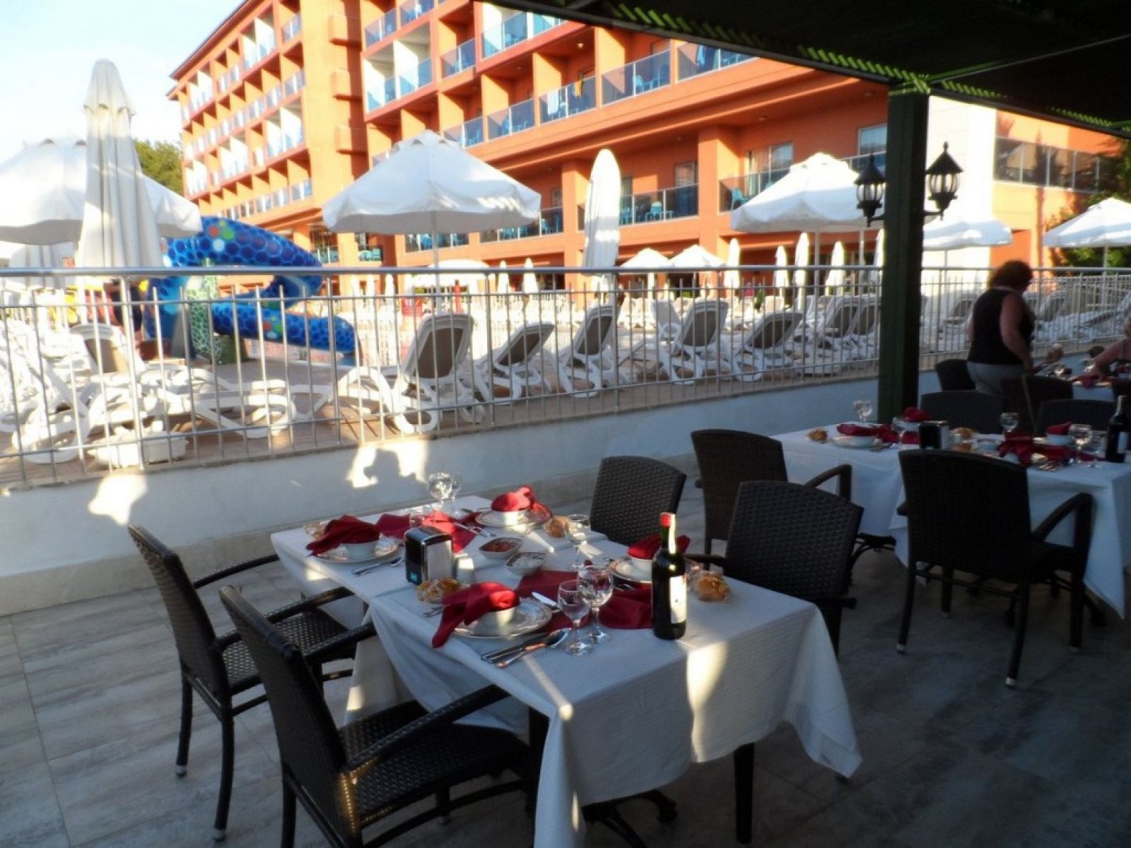 На територията на хотела: 1 основен ресторант с открита и закрита зона, 1 снек ресторант до басейна, 1 снек ресторант на плажа, общо 5 бара, 2 външни неотопляеми басейна (до основната сграда с две водни пързалки и до новата анекс сграда с три водни пързалки), 1 вътрешен басейн (неотопляем), фитнес зала, СПА център, дневна и вечерна анимация, комфертени зали.