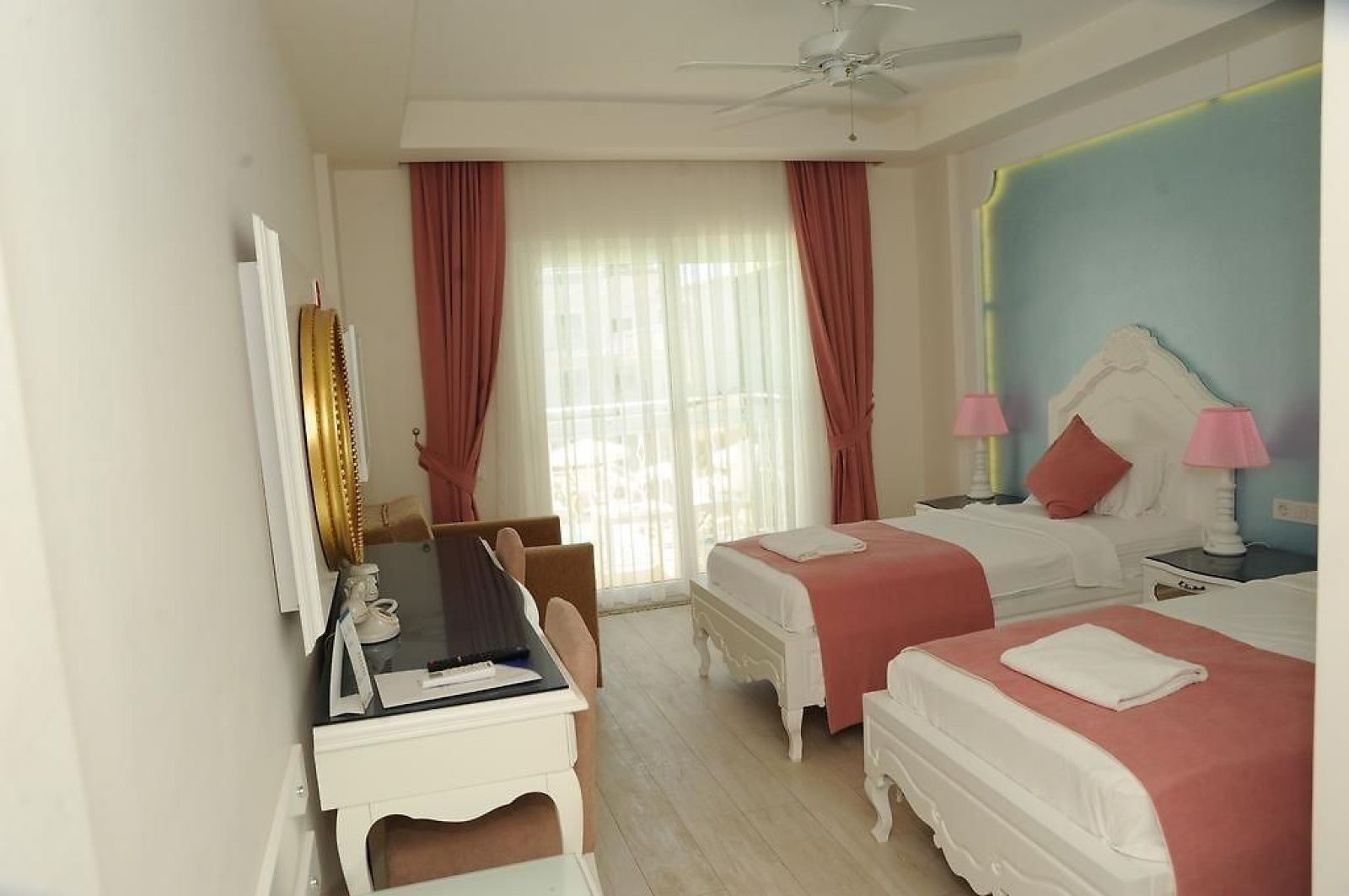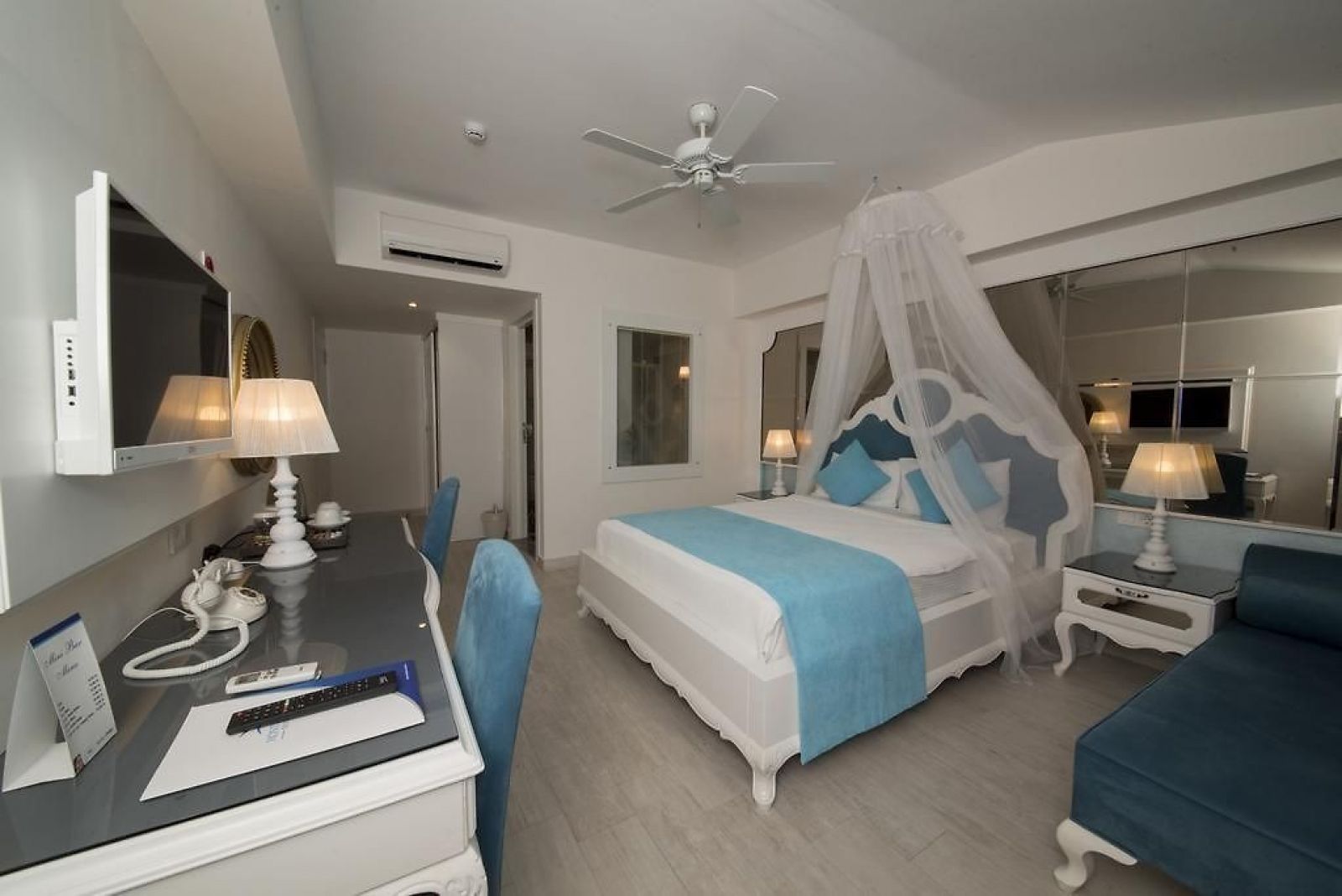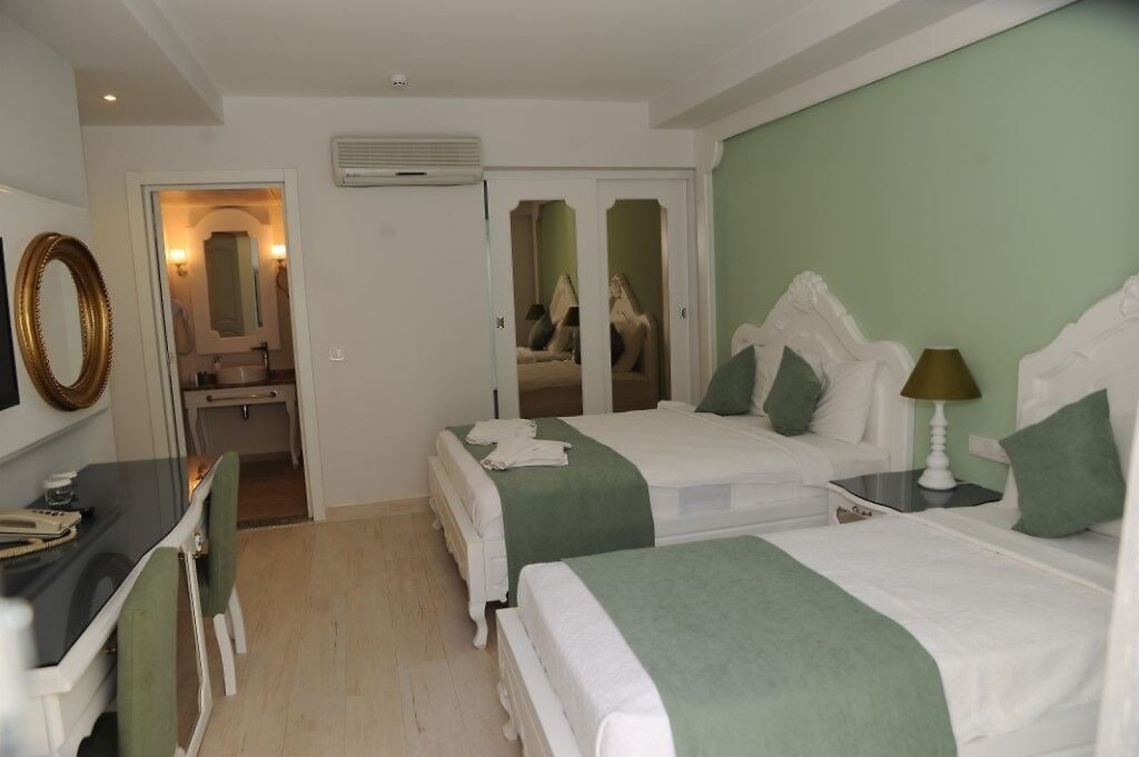 Стаи: Honeymoon Room (18 m2, специален дизайн за меден месец, подова настилка от керамични плочки, балкон, баня и душ кабина, климатик тип сплит, сешоар, електронен сейф, сателитна телевизия (LCD), директен телефон, минибар и електрическа кана.)