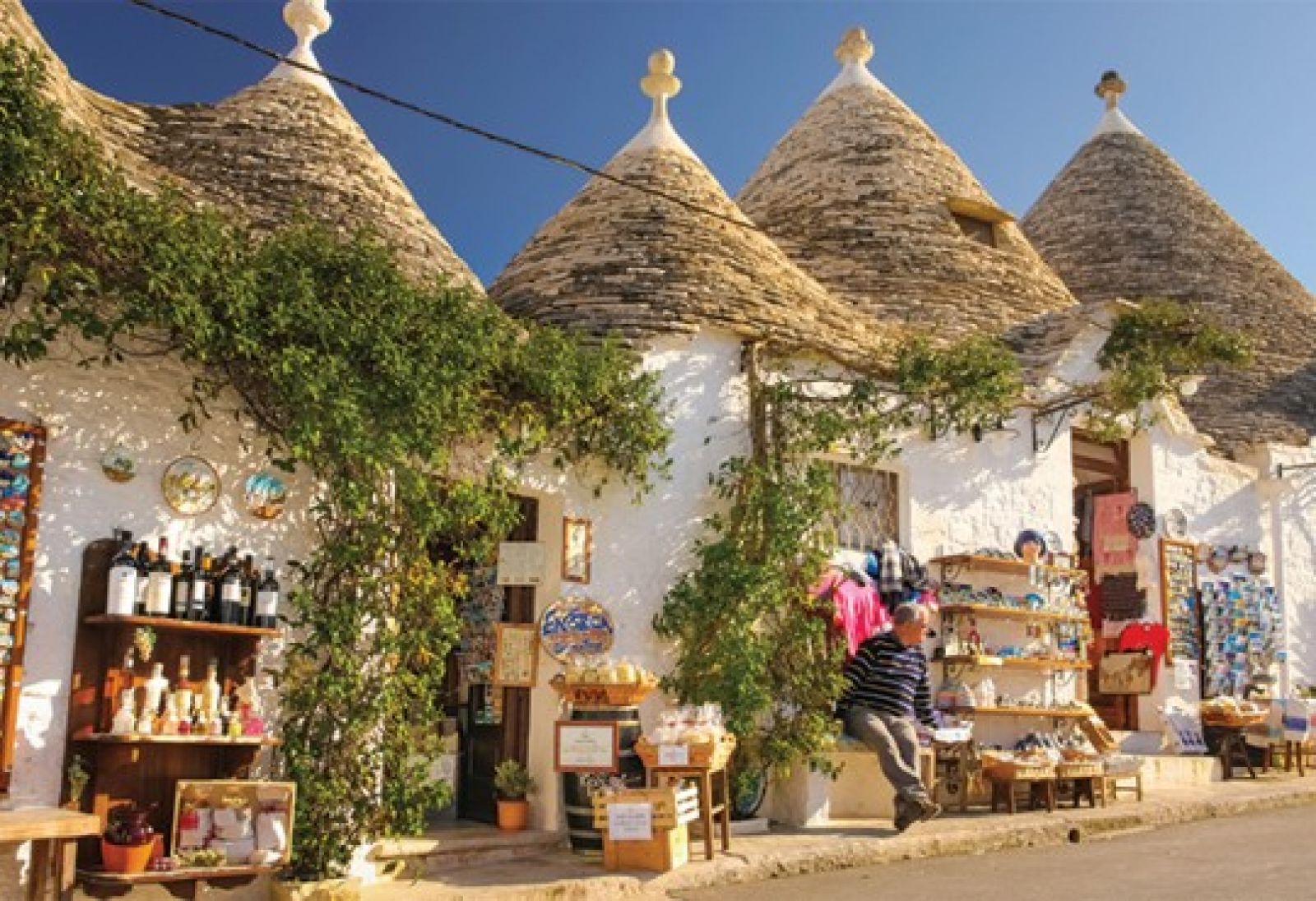 Закуска. Целодневна екскурзия до приказната столица на трулите Алберобело и до Локоротондо – едно от стоте най-красиви малки градчета в Италия, притежател на световен рекорд (включена в цената). Алберобело – посещение на приказната столица на трулите. Алберобело е град с толкова особено обаяние, че е трудно да се ориентирате къде се намирате. Столицата на Трулите сякаш ви пренася в детска книжка с приказки. Трулите са малки бели къщички от варовик с конусовидни покриви. Градени в миналото без всякаква спойка, те наподобяват по форма ескимоско иглу. В близост до главния площад се намира църквата „Санта Лучия”, както и градския музей „Територио”. Музеят е направен от 10 трули обединени в една. В музея може да се види историята на създаването на трулите и как обитателите им са живеели в тях в миналото. Алберобело има и други музеи, които предлагат на туристите сувенири и почти всичко, което една селска къща произвежда. Някой от по-интересните са: Музея на виното и Музея на зехтина. В цената е включена дегустация на домашно произведени ликьори и сладки. Локоротондо – едно от 100-те най-красиви малки градчета в Италия, чийто историческия център е застроен в овална форма, откъдето идва и името му. Градът е записан в книгата на рекордите на Гинес, заради петте гласни „о“ в името си. Това е град на красивите балкони, повечето от които си имат номера. Градът е известен и със своите вина.