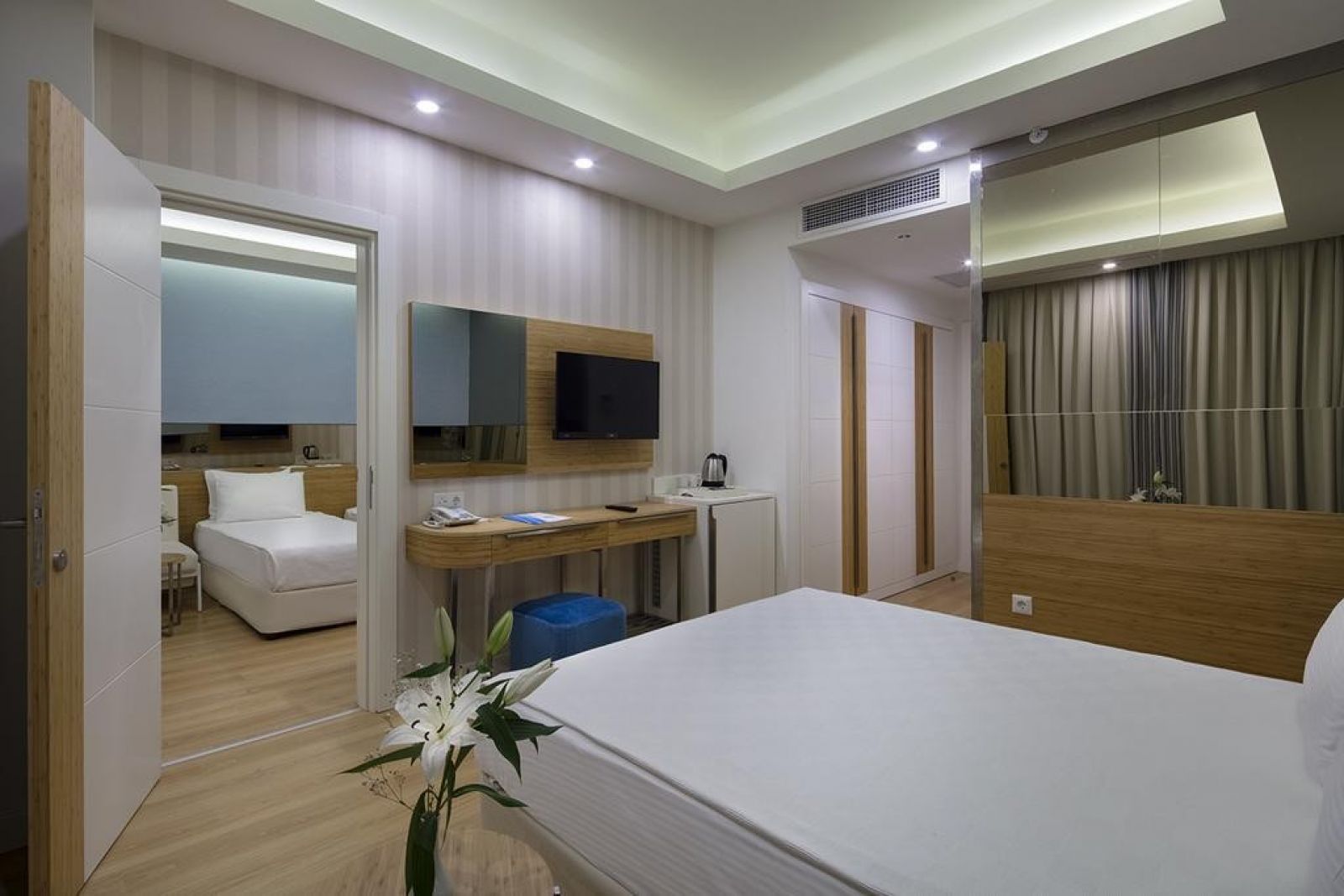 Family Rooms: - 33 м2. Всички семейни стаи са с 2 спални, 1 баня и са свързани с врата. Едната стая е с френско легло, а втората стая е с единично легло или двуетажно легло + допълнително легло. Всички стаи са оборудвани с телефон, сейф (безплатно), минибар, сателитна телевизия, сешоар, VRV климатична система. Всички семейни стаи имат балкон. Гледка към градината или околността.