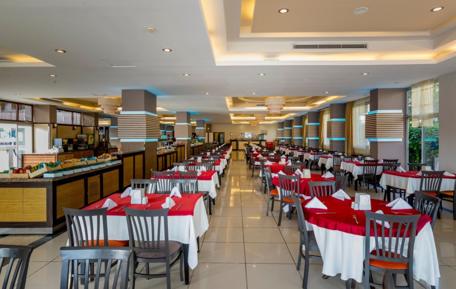 Основен ресторант, 3 бара, открит и закрит басейн, 3 водни пързалки, фризьор, 2 конферентни зали, Безплатни услуги: турска баня, сауна, аеробика, плажен волейбол, тенис ракети под наем, дартс, дискотека (напитки - платени), скуош, кану, безмоторни водни спортове. Платени услуги: Масаж, парна баня, билярд, осветление тенис корт, Интернет кафе, моторни водни спортове.