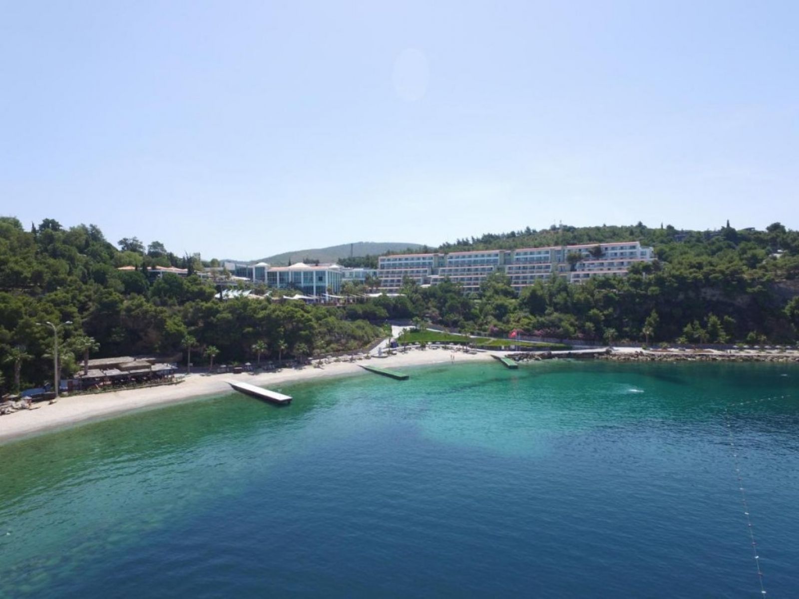 Собствен, пясъчен с дължина 1200 м, притежаващ сертификат "Син флаг" и платформа. Чадъри и шезлонги на плажа и при басейните – безплатно. Плажни кърпи - безплатно.