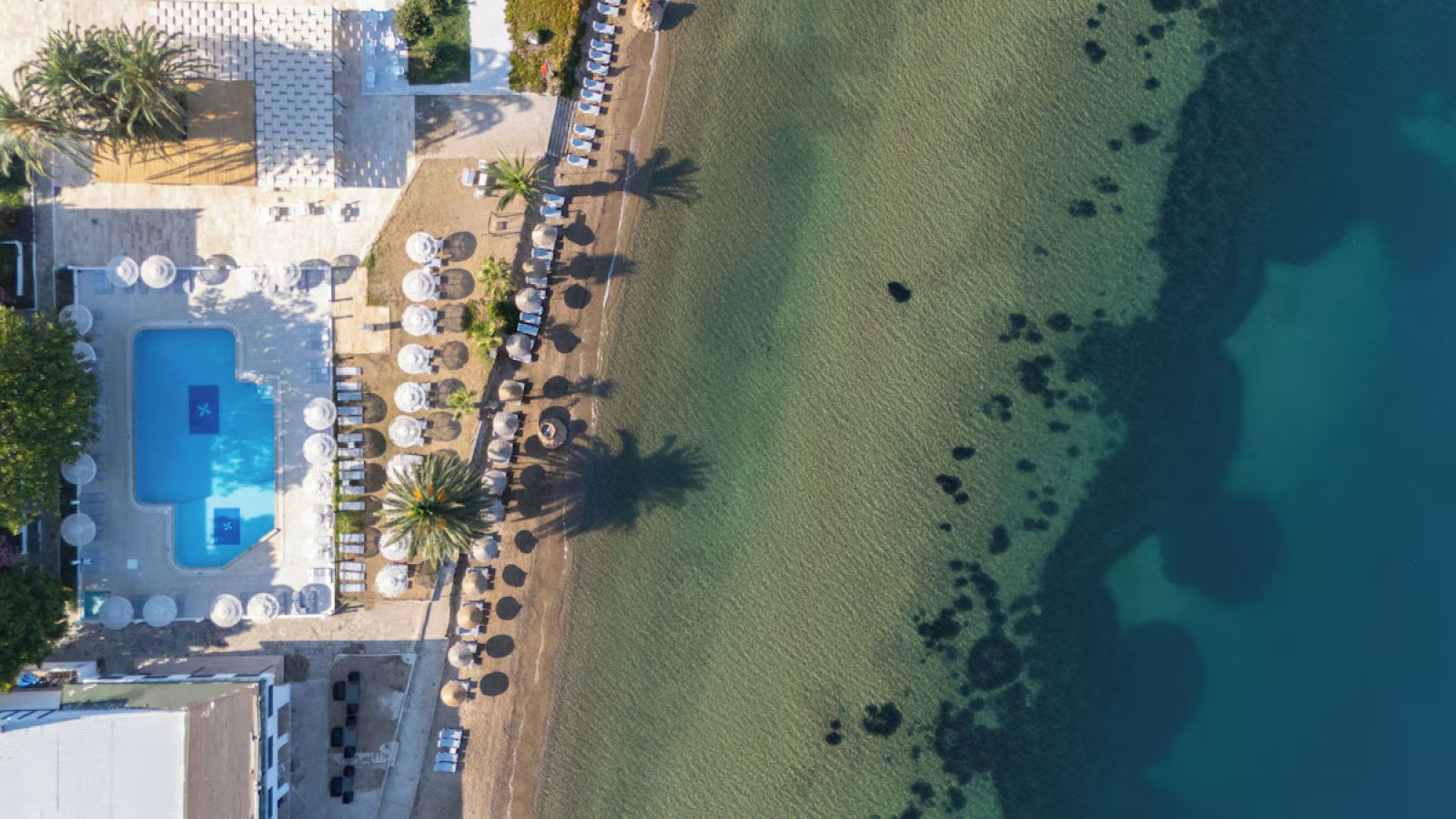 Собствен плаж: пясъчно-чакълест. Чадъри, шезлонги, кърпи на плажа и при басейна-безплатно.