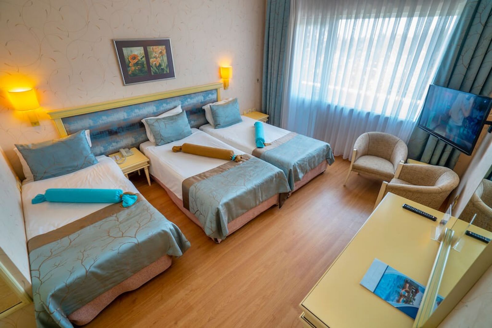 В стаите: Стаите предлагат следните удобства: рум сервиз, телевизор, централен климатик, минибар (срещу заплащане), сейф (срещу заплащане), душ или вана, сешоар, телефон, подова настилка или мокет, балкон или тераса (не във всички стаи).