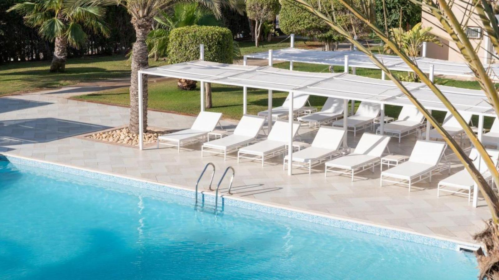 Открит басейн: Басейн с шезлонги и чадъри, предоставящ комфорт и релакс.
