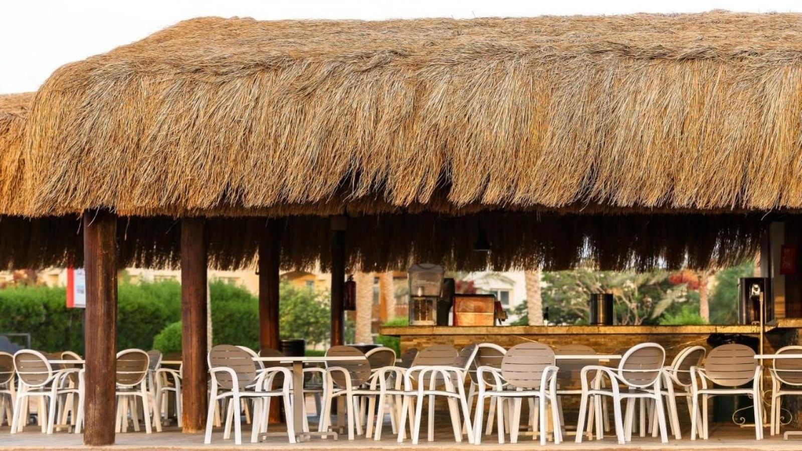 Гледащ към основния басейн, тук е мястото където ще можете да се насладите на закуската, обяда и вечерята си.