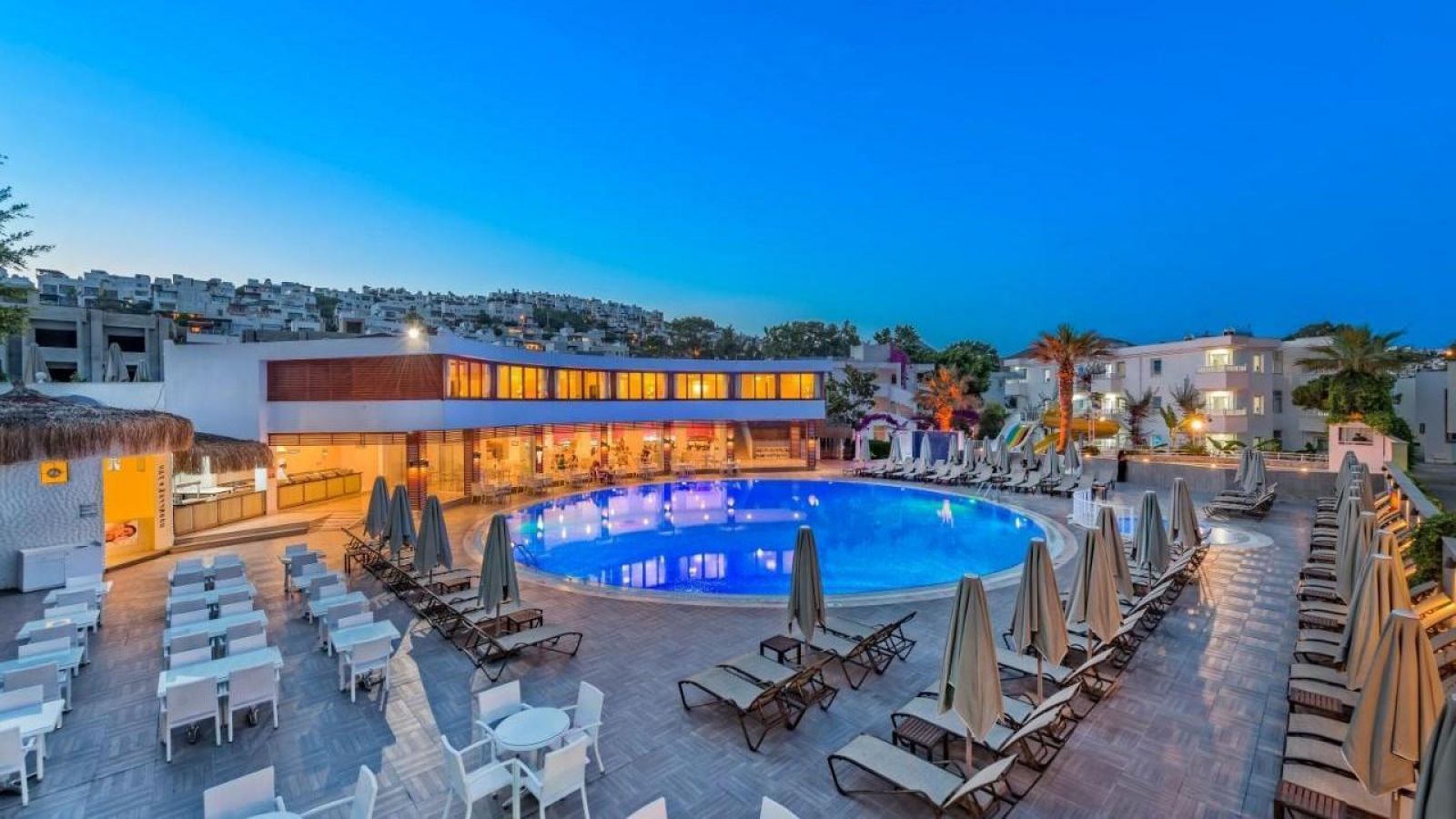 Bendis Beach Hotel 4* е декориран в син и бял цвят, които са специални за Бодрум, тъй като архитектурата в този район е украсена именно в тях. Хотелът разполага със 7 блока и All Inlcusive база на изхранване през летния сезон. Инфраструктурата позволява настаняване на хора с двигателни проблеми и стаи за непушачи.