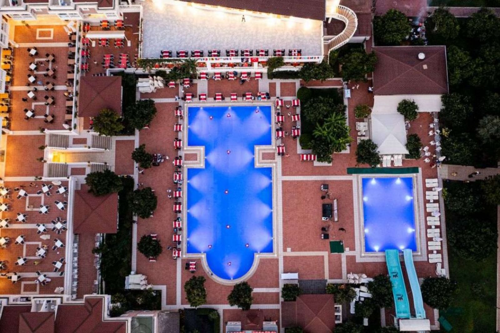На територията на хотела: Основен басейн; Басейн с пързалки; Релакс градински басейн; Вътрешен басейн; Детски закрит басейн с дълбочина 0.30м, 27м2. Основен ресторант, а ла карт ресторант (срещу заплащане и предварителна резервация), снек бар, бар на плажа, релакс бар, бар на басейна, Сауна, турска баня, парна баня, фитнес (безплатно).