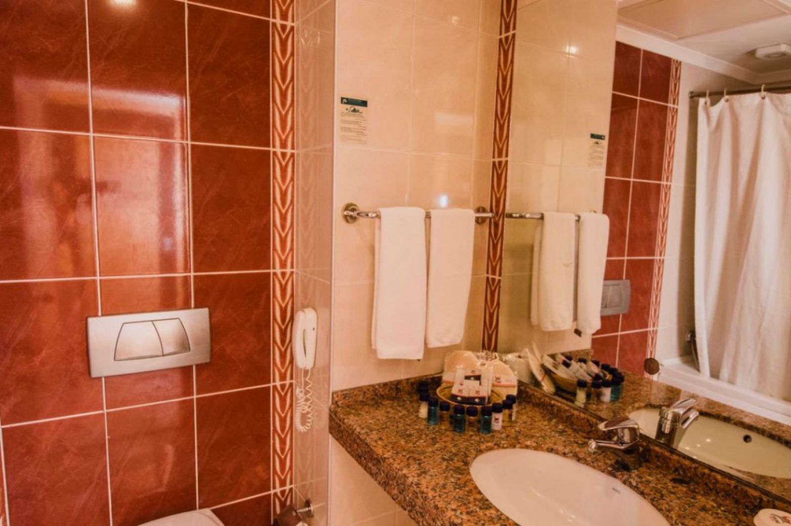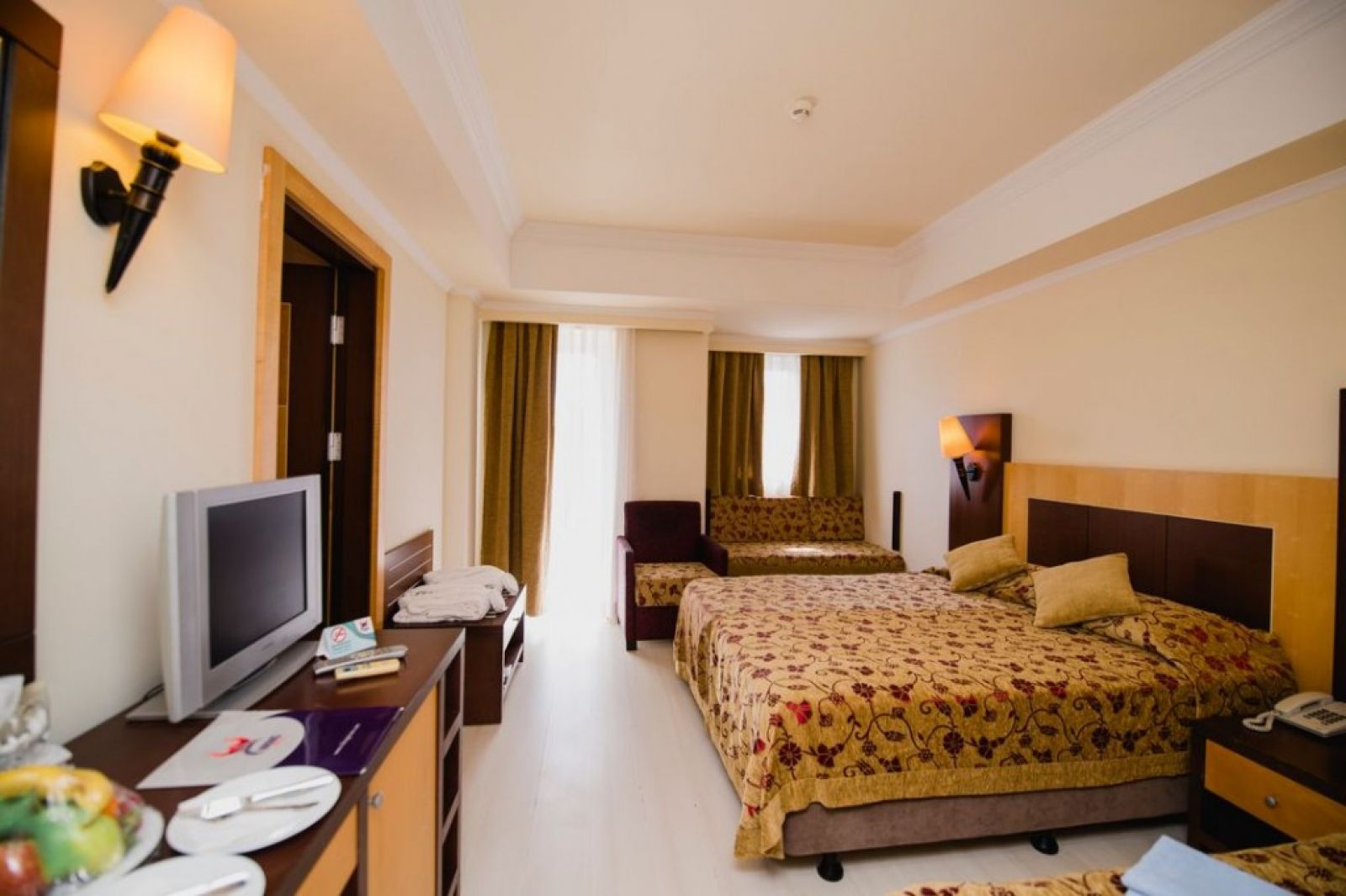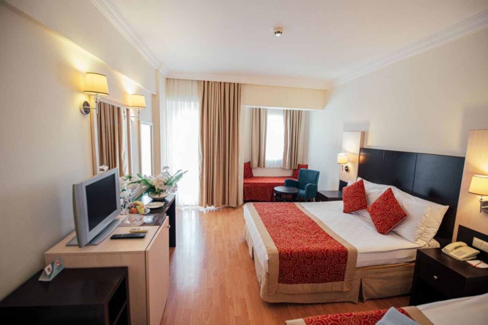 В стаите: Хотела разполага с 215 стандартни стаи (22m2 - 24m2), от които 2 стаи за хора с увреждания (24 m2). Стаите са оборудвани с: Електронна система за заключване на вратата, Сплит система – климатик, Балкон, Сешоар, Душ/тоалетна, Безжичен интернет (платен); 16 фамилни стаи (26 м2), оборудвани с: Електронна система за заключване на вратата, Сплит система – климатик, Балкон, Сешоар, Душ/тоалетна, Безжичен интернет (платен). Почистването и смяната на хавлиите се извършват всеки ден, а смяната на бельото се извършва три пъти седмично. Директен телефон, сателитна телевизия са налични. Подовите настилки са с ламинат/теракот. Сейфът се заплаща. Минибар (една безплатна бутилка вода в деня на пристигане).