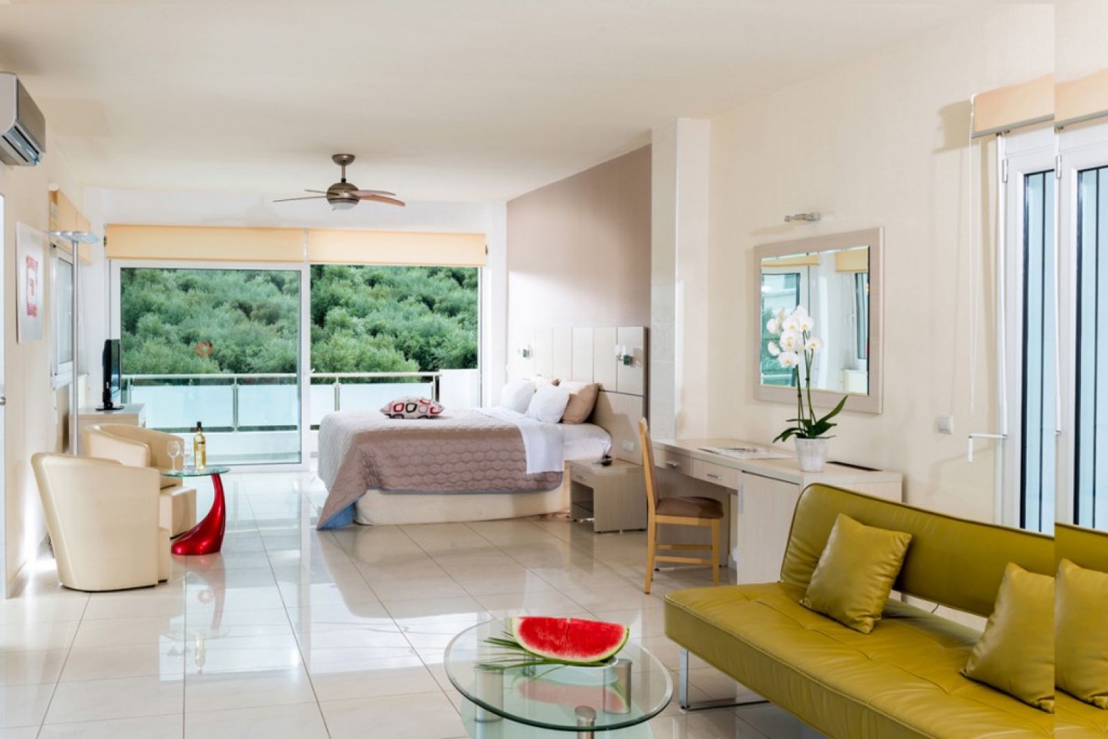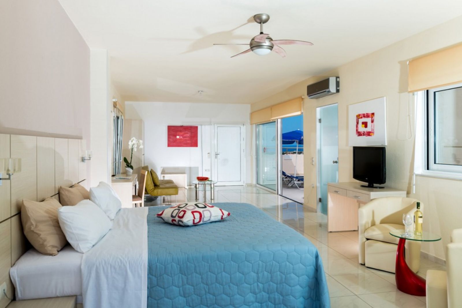 В стаите: Стаята включва следните удобства: сателитна телевизия, индивидуален климатик, минибар, сейф, душ, сешоар, телефон, CD плейър, хладилник, балкон или тераса и Wi-Fi.