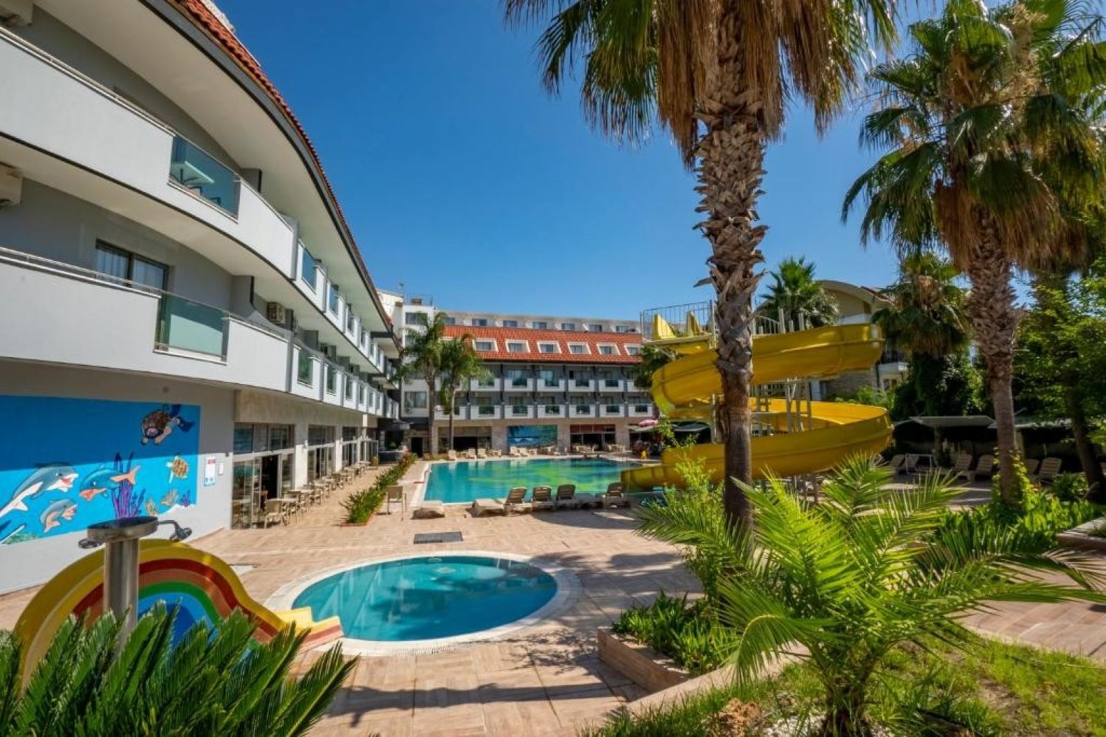 Разположение: Хотелът се намира на 55 км от летището в Анталия, на 500 м от центъра на Кемер. Построен е през 2006 г., на територия с обща площ от 13 000 м2, последна реновация е направена през 2024 г.
