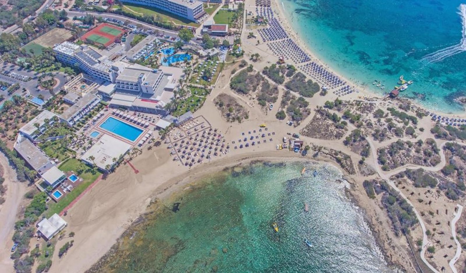Курортът е разположен на златните пясъци на залива Ниси, на плажа Макронисос, западно от Агия Напа, на тихо място, заобиколен от добре поддържани градини. Ресторантът на хотела предлага международна и местна кухня. Гостите могат да се насладят на освежаващи алкохолни и безалкохолни напитки в бара. Хотелът предлага на гостите разнообразие от спортни дейности и развлечения, включително минифутбол, тенис на маса и разнообразие от водни спортове. Хотелът разполага с открит и закрит плувен басейн и СПА център, където гостите могат да се насладят на масажи и козметични процедури. За децата има отделен басейн с мини пързалки.