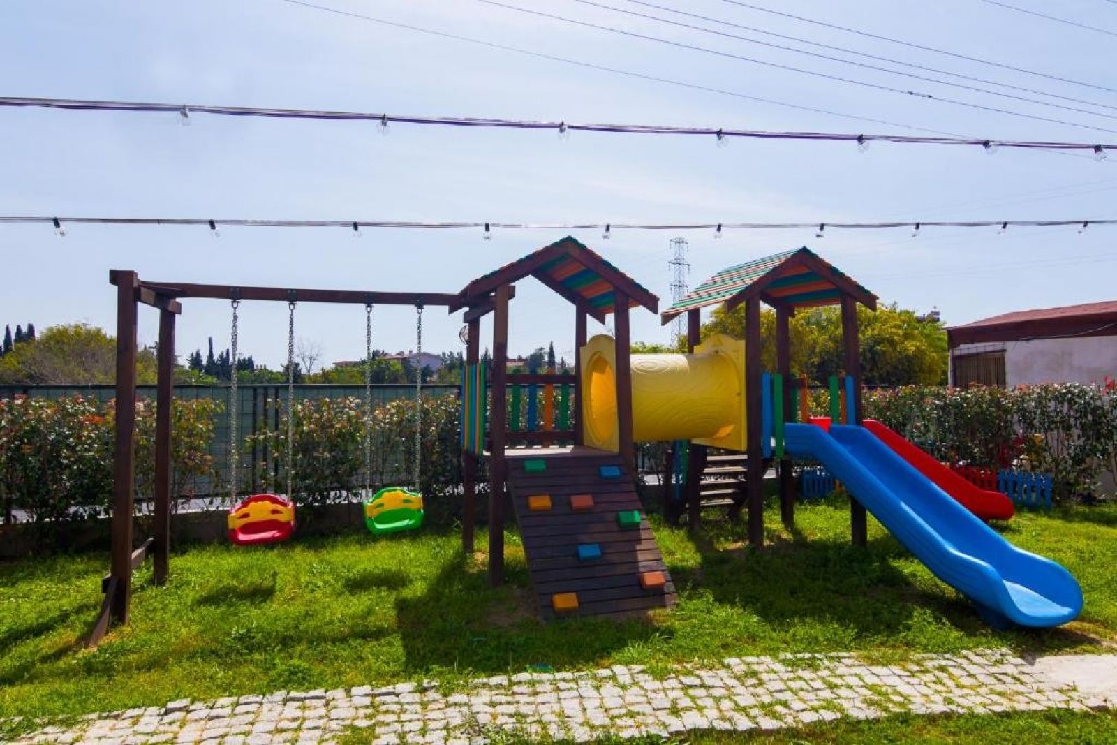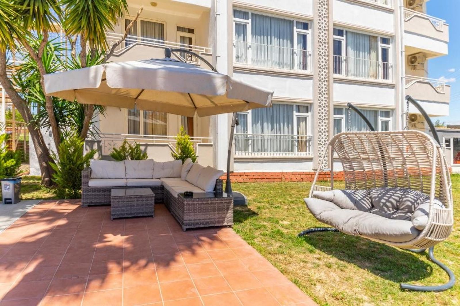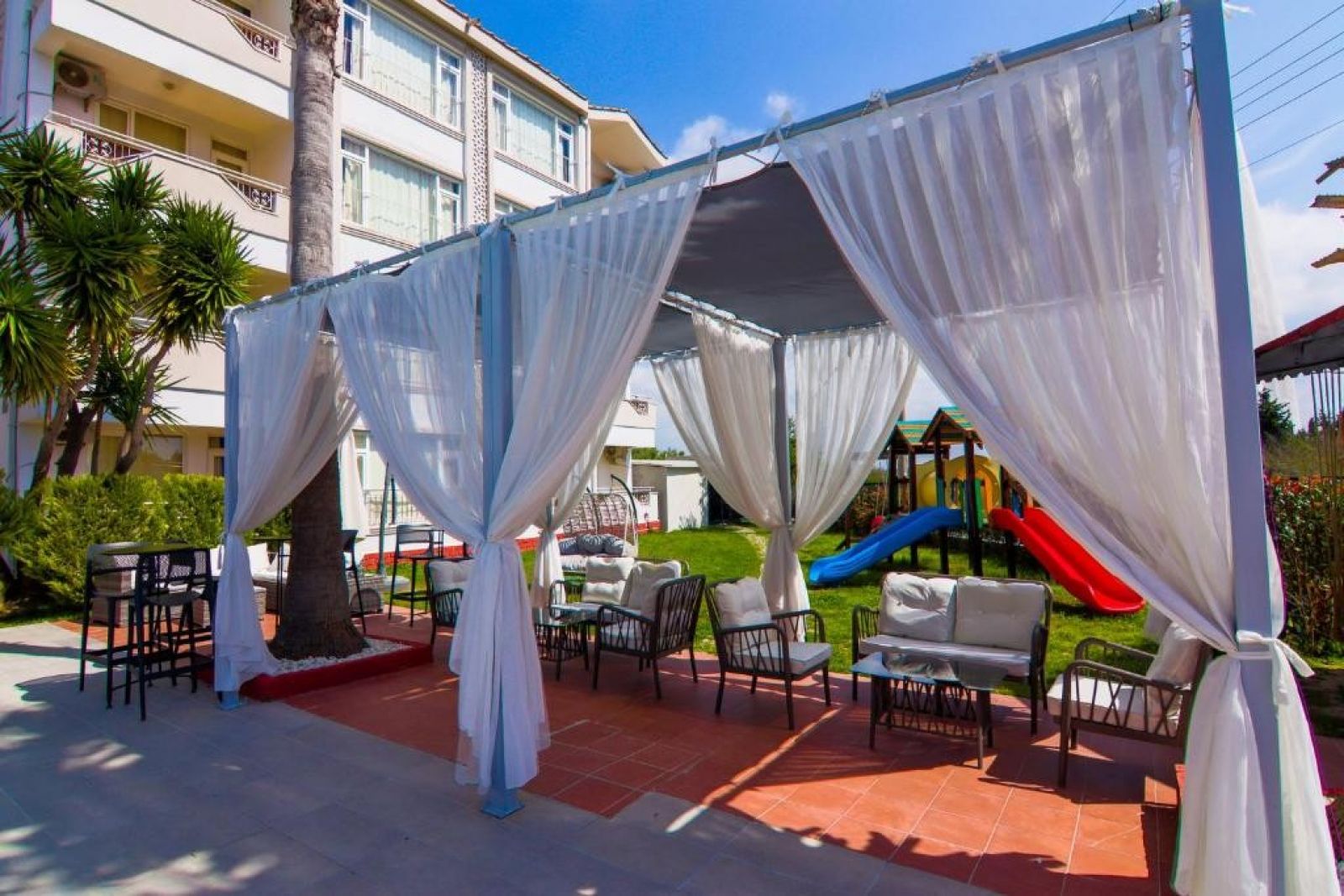 На територията на хотела:В нашия хотел New Garden Side има общо 64 стаи, той е с обща площ от 5000 м2, включително открит плувен басейн с площ 200 м2 и детски басейн, в градината има тревни площадки за деца и отделни зони за отдих за възрастни, в хотела има също пазар и магазин за сувенири.