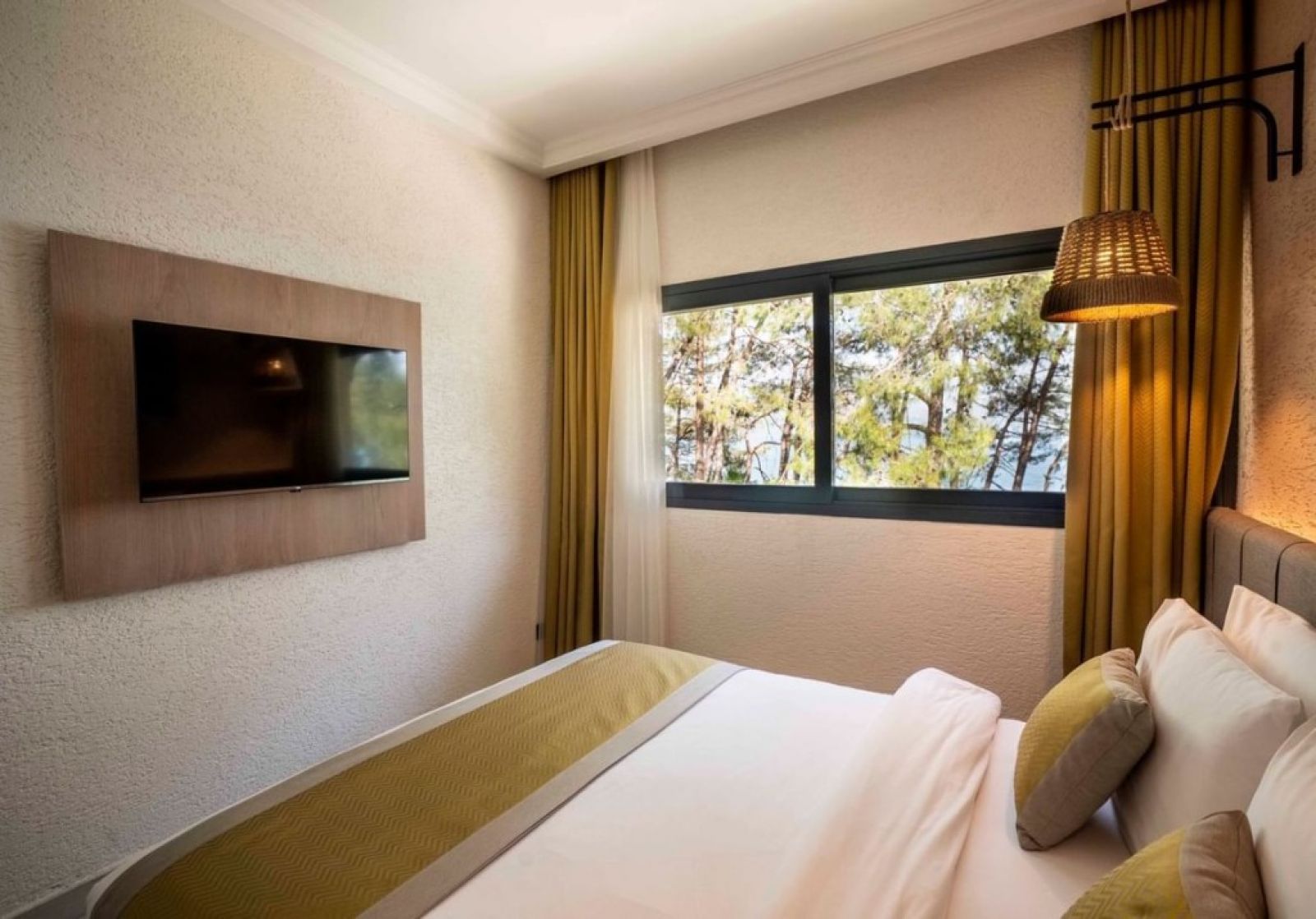 Bungalow-One Bedroom - 26-30 m², Този тип стаи с една спалня са разположени в градината. Всяка стая разполага с едно двойно или две единични легла. В повечето от този тип стаи има разтегателен диван. Всички стаи разполагат с баня с душ, балкон или тераса, а повечето са с изглед към морето. Останалите са с изглед към градината или гората.