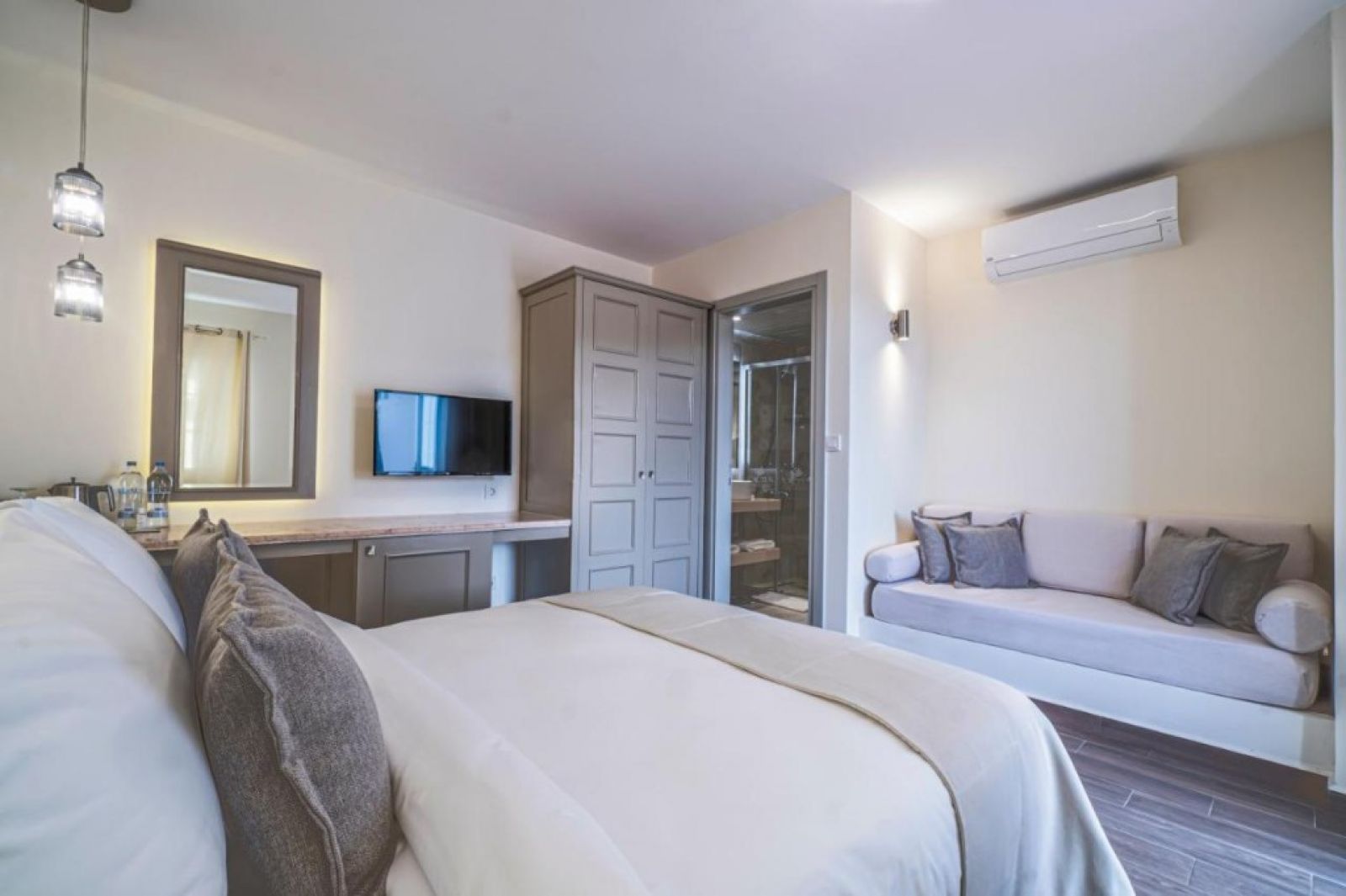 Стаи: Със светлото и модерно, вдъхновено от изкуството и културата, всяка стая е напълно реновирана през 2021 г. и всички имат фантастична гледка към морето. Стаите са оборудвани с тераса/ балкон, телевизор, WiFi интернет, сет за приготвяне на кафе и чай, баня с душ, тоалетни принадлежности. Апартаментите разполагат с кафе машина, както и отделна дневна зона.