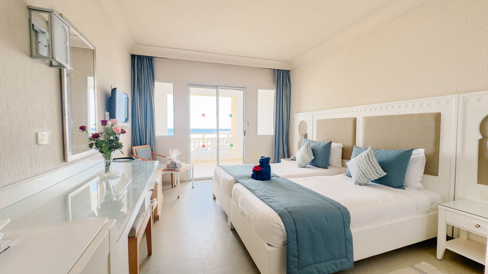 Всички стаи са оборудвани с климатик, телевизор, телефон, баня с душ/вана, сешоар, сейф, мини бар (зареден в вода при пристигане), балкон или тераса, Wi-Fi. Почистване на стаите - всеки ден.