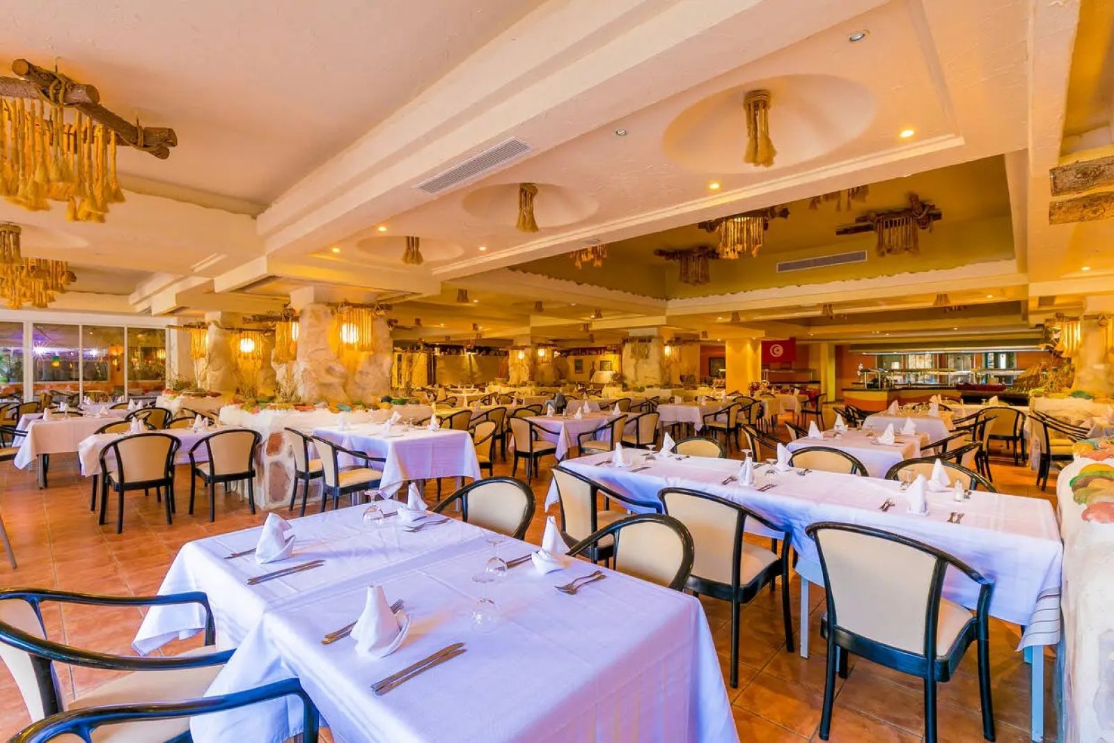 Основен ресторант, 2 а-ла-карт ресторанта (тунизийски и марокански – срещу заплащане/с предварителна резервация, съгласно концепцията на хотела/1 безплатно посещение на 1 от ресторантите при минимум 7 нощувки), 3 бара, мавританско кафене (срещу заплащане), открит басейн, 3 водни пързалки, закрит басейн (от 01.11 до 31.03), закрит басейн с морска вода в Таласо центъра (срещу заплащане), 2 конферентни зали и заседателна зала, магазин, обмяна на валута, денонощна рецепция, Таласо център.