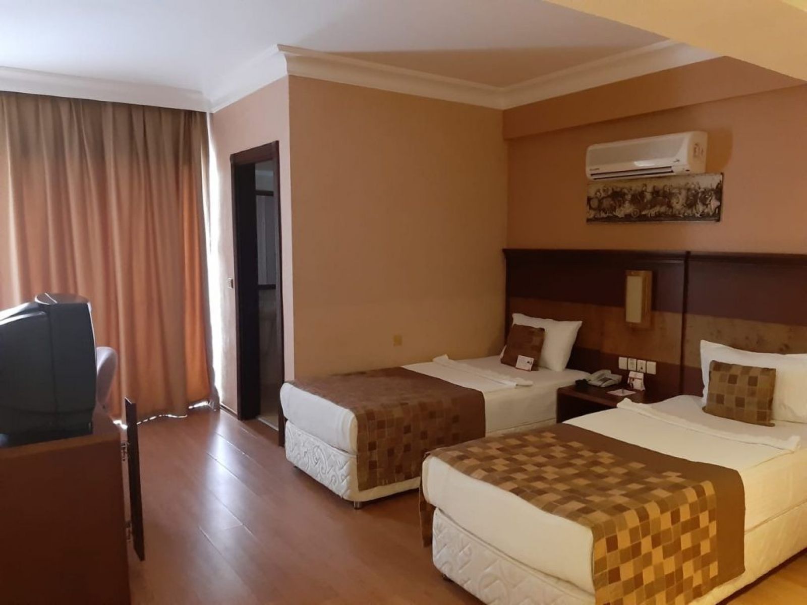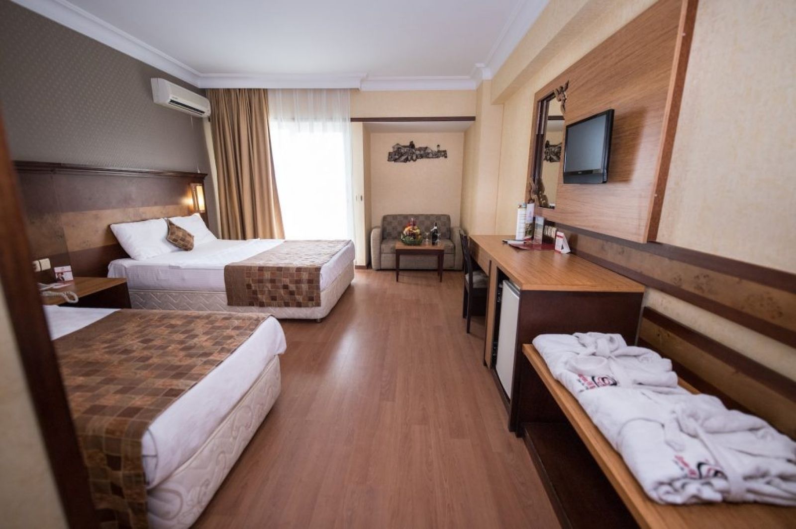 В стаите - Хотелът разполага с общо 246 стаи, от които 88 стандартни с изглед градина (24 м²), 89 стандартни с изглед море (24 м²), 17 фамилни стаи (свързани стаи - 48 м²), 22 супериор стаи (26 м²), 8 промо стаи (20 м²) и 2 суита. Всички стаи са оборудвани с климатик, телевизор, телефон, баня с душ/вана, сешоар, мини бар (платен), сейф (безплатен). Почистване на стаите - всеки ден, смяна на спалното бельо и кърпите - 2 пъти в седмицата.