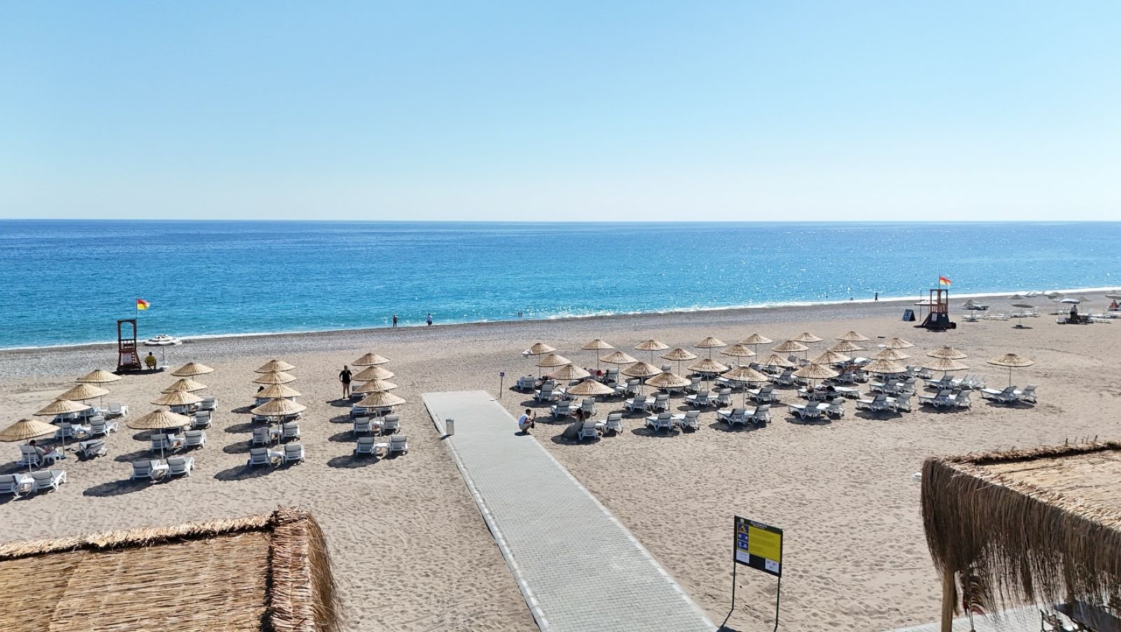Собствен, пясъчно - чакълест, на 180 м от хотела. Чадъри, шезлонги и плажни кърпи на плажа и при басейна - безплатно.