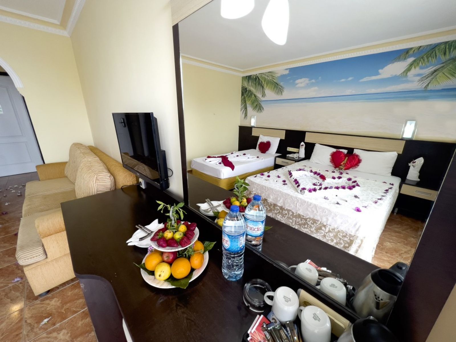 Безплатни услуги: Сауна, парна баня, водни пързалки, аквапарк, детска площадка, целодневна анимация, мини клуб, плажен волейбол, фитнес зала.