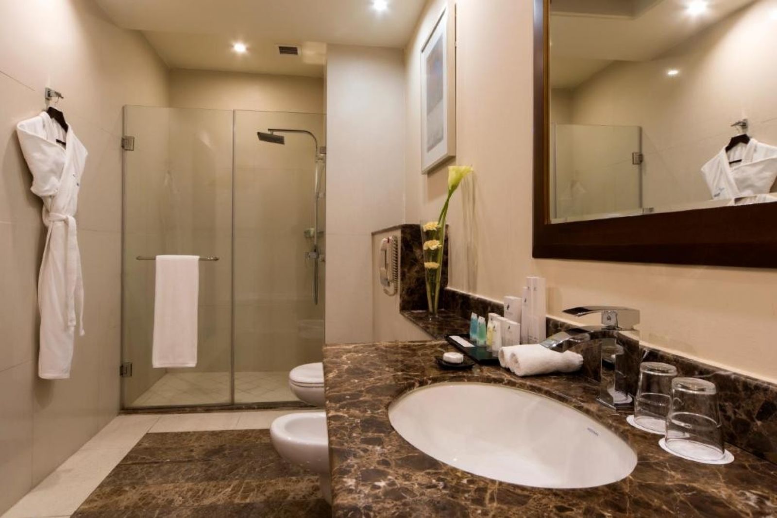 Стаите: Във всички стаи има телевизор, електрическа кана, минибар, кът за хранене, принадлежности за гладене, вана или душ, тоалетна и тоалетни принадлежности.
