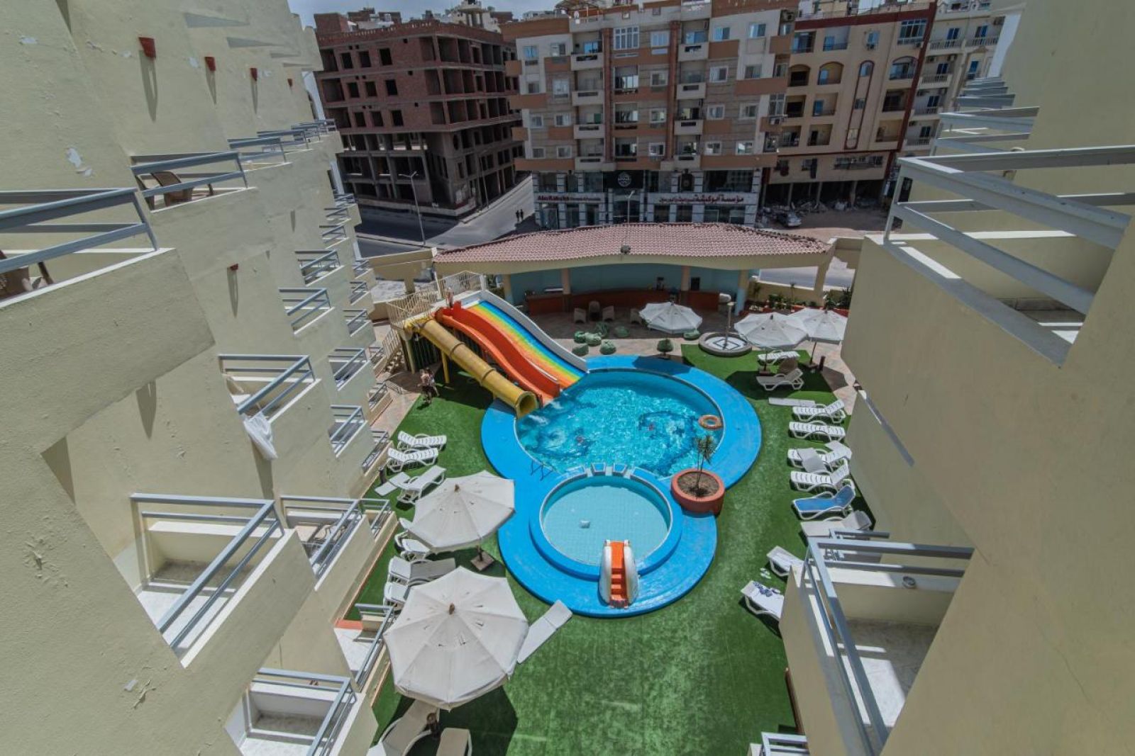 Намира се на 10 км. от летище Хургада, на 10 км от центъра на Хургада, на брега на морето.