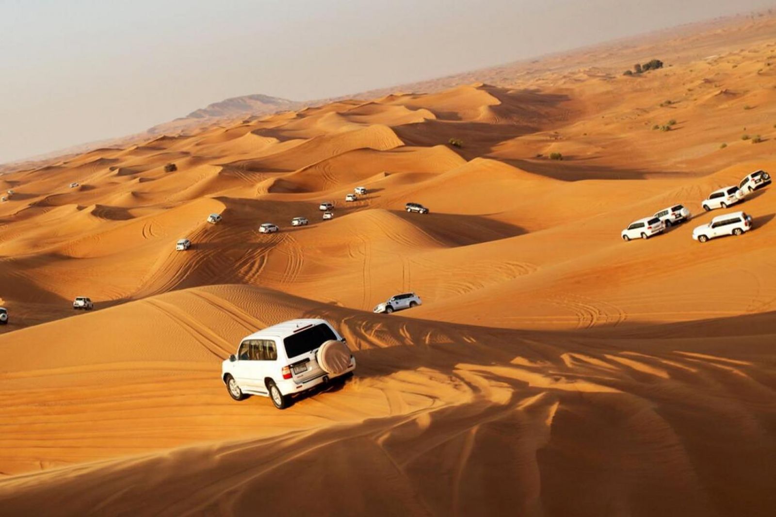 Това е незабравимо арабско приключение, което Ви отвежда далеч от шумния Дубай, сред златисти пясъчни дюни. Отпътуване с луксозни джипове 4х4 и достигате за около 45 мин. до пустинята. Тук започва истинско приключение сред дюните, невероятен смях и забавления. Фотопауза за снимане на залеза над дюните. Пристигате в бедуинско селище, където Ви очаква посрещане с арабско кафе и фурми и вечеря барбекю под открито небе. Тук можете да се облечете в традиционни арабски дрехи, да пояздите камили, да покарате сърф или ски по пясъчните склонове, да си направите временна татуировка с къна, да пушите наргиле. Преди да се завърнете в Дубай ще потанцувате местни танци на фона на арабска музика.