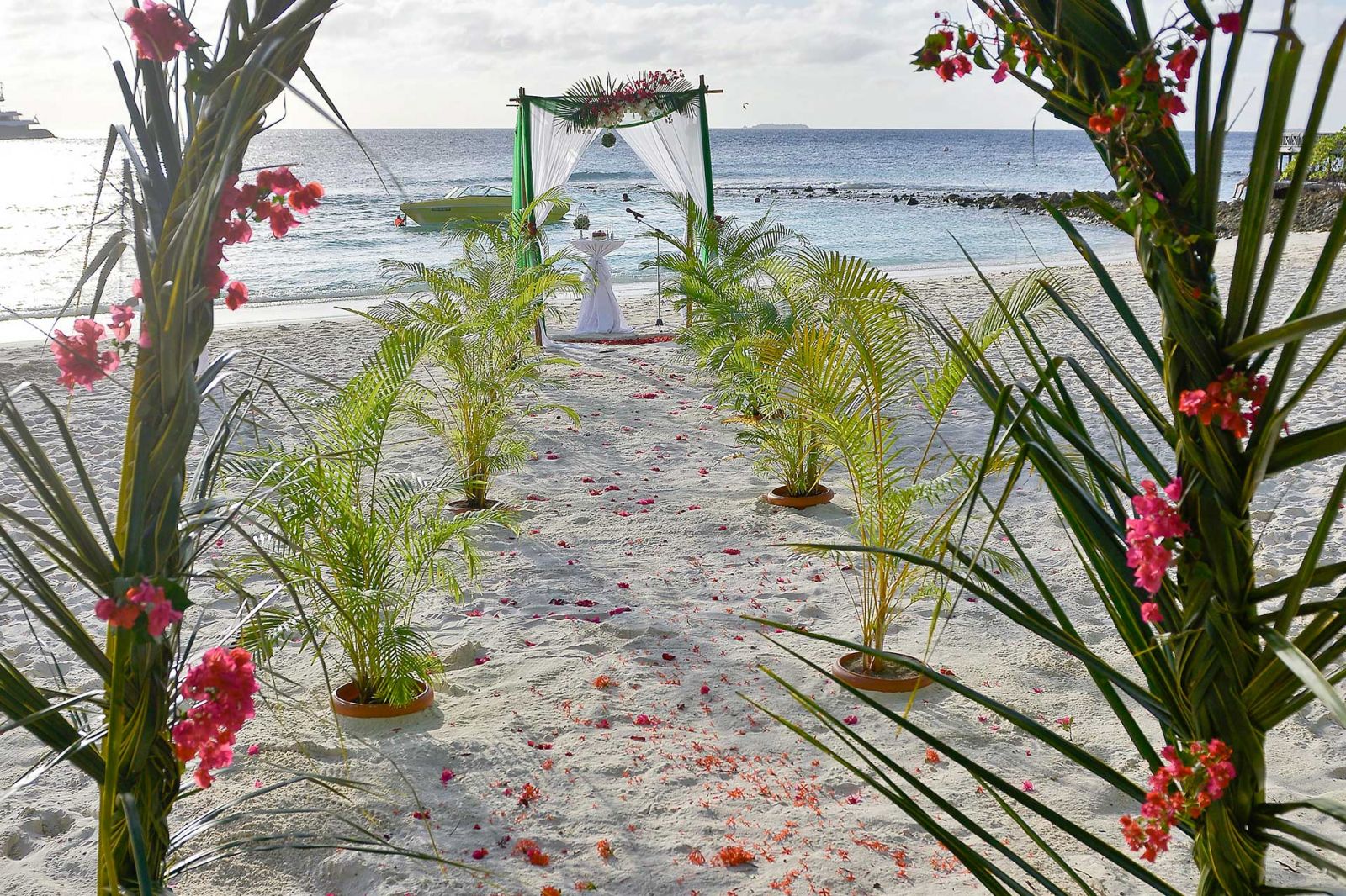 Тематичната сватба за тропическия рай обединява живите цветове на Малдивите. Разкошни цветя, подредени сложно, предизвикват романтично усещане за тропическо богатство. Декорации в местен стил и буйни сърцевидни кокосови листа украсяват церемонията заедно с впечатляващ вход на арката. Естествените дървени тави, пълни с разнообразни цветя в живи цветове, служат като централни елементи. Тропичният ритъм на малдивските барабани ще сигнализира за началото на тази уникална церемония.