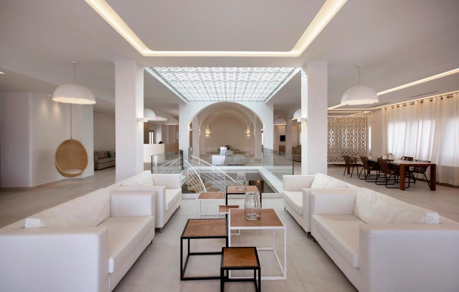 Aqua Blue Beach Hotel е разположен на плажа Периса и разполага с частен плаж с шезлонги и чадъри. Фира, оживената столица на Санторини, се намира на 15 км, а летище Санторини и пристанището са на 20 минути с автомобил. В близост до хотела има условия за водни спортове. Наблизо има и ресторанти, както и други възможности за развлечения.