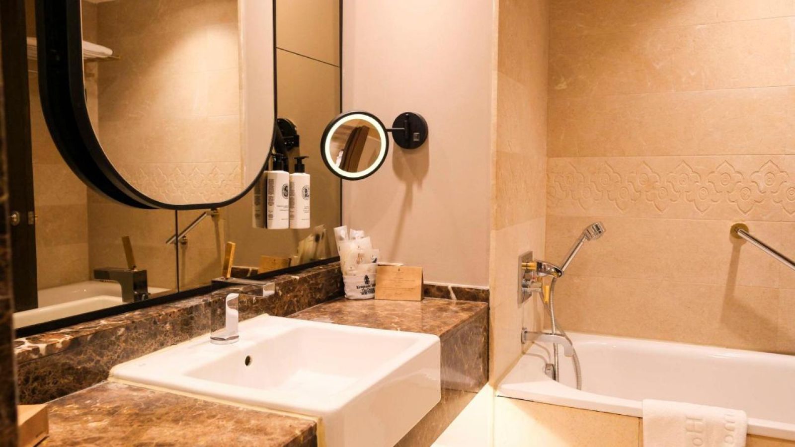 вана и душ,сешоар,везна,халат,чехли,централен климатик (Main building, регулира се от гостите на хотела),индивидуален климатик (villas,плазмен телевизор (може да се използва и като монитор за компютър – срещу допълнително заплащане),телефон,мини-бар (платено), сейф (в стаята, безплатно),под – паркет,балкон или тераса,почистване на стаите – ежедневно,смяна на спално бельо (по желание на гостите, ежедневно),room service (24 часа, платено),интернет (безжичен, кабелен, безплатно).