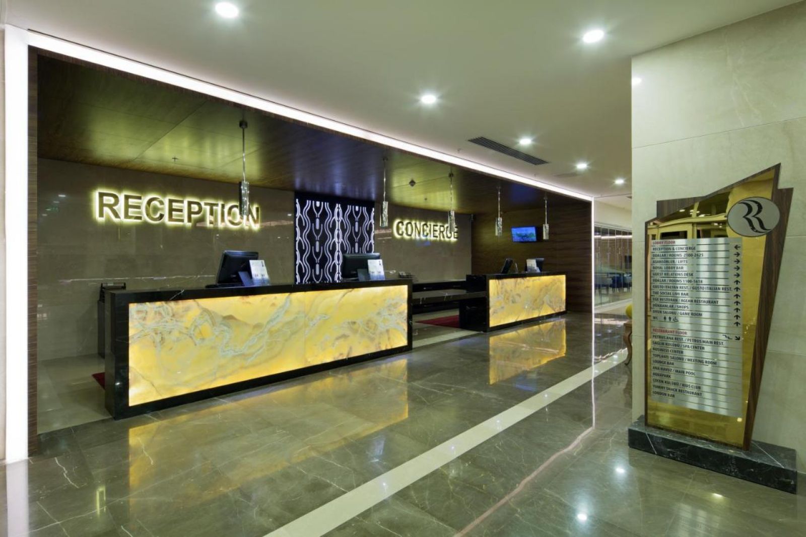 Основен ресторант, 3 а-ла-карт ресторанта (италиански, турски и рибен - с предварителна резервация, съгласно концепцията на хотела / 1 безплатно посещение на 1 от ресторантите при минимум 7 нощувки), 3 бара, бар на плажа, 4 снек бара, сладкарница, дискотека, 3 открити басейна, 1 закрит басейн, басейн с джакузи, аквапарк, амфитеатър, конферентна зала, СПА център, голф игрище, магазини, асансьор за хора с увреждания за ползване на открития басейн, паркинг.