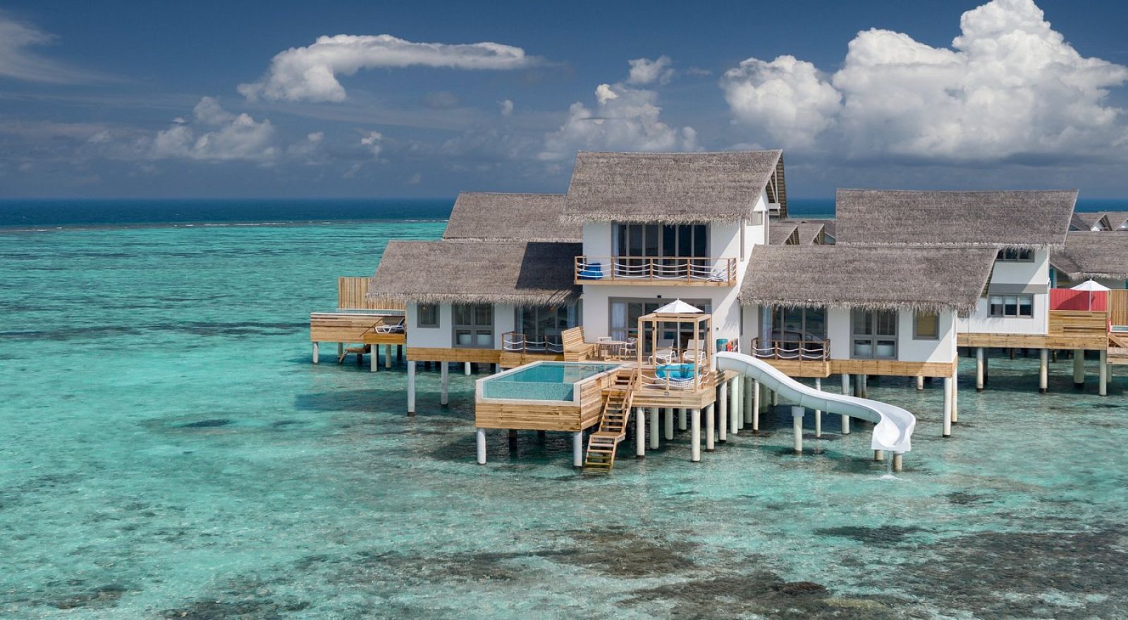 - 1 Two Bedroom Lagoon Pool Villa with Slide (251 кв.м) - двуетажна водна вила с басейн, водна пързалка и изглед към залеза. На партерен етаж: дневна с трапезария, тоалетна, спалня с двойно легло king size, спални с 2 отделни легла, 2 бани с отделни бани и душове, тераса с басейн, шезлонги, водна пързалка, зона за отдих и спускане във водата. На втория етаж: дневна с трапезария и балкон. Максимално настаняване - 4 възрастни и 2 деца или 3 възрастни и 3 деца или 2 възрастни и 4 деца.