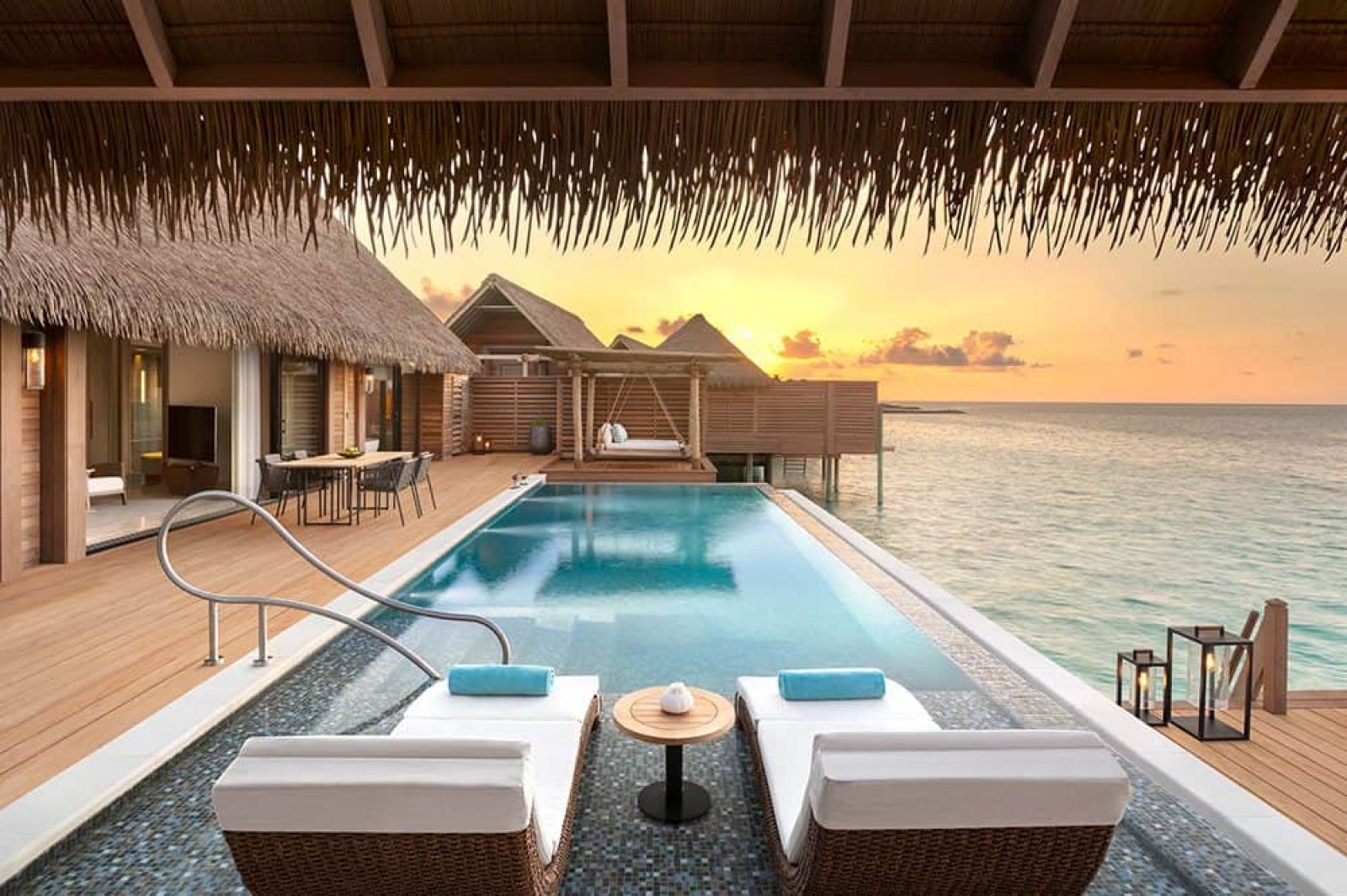 - 1 Three-Bedroom Overwater Villa with Pool (1113 м2; макс. 7 или 6+3 души). Водна вила с три спални (две с големи легла; една с отделни две единични легла/третата спалня се намира отделно от целия комплекс), всекидневна, трапезария, стая за бавачка. Тераса с кът за хранене и почивка, два частни басейна (10x4 и 15x4), джакузи, надводен хамак, директен достъп до рифа.